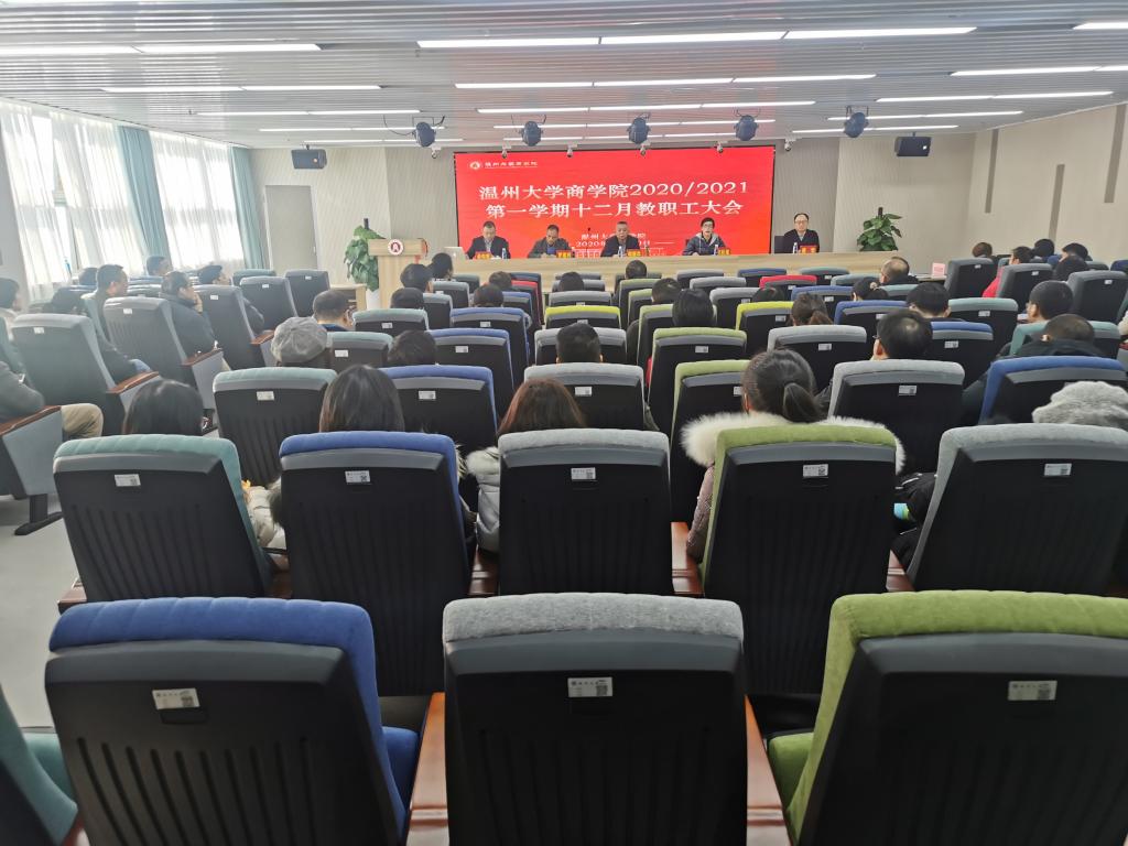 12月30日下午,温州大学商学院在A226仲辉商道讲堂举行全院教职工大会,学院领导班子以及全院教职工出席会议,会议由学院党委书记郑彩莲主持。