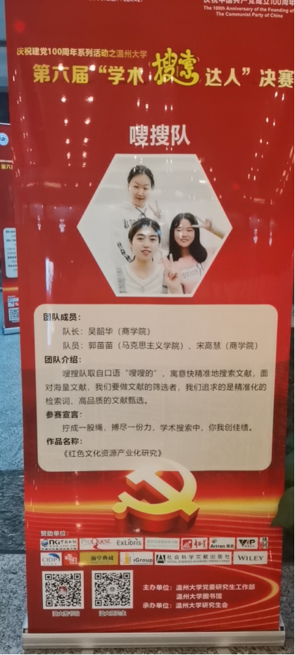 研究生吴韶华带领的“嗖搜队”脱颖而出,其作品名为《红色文化资源产业化研究》荣获决赛一等奖。