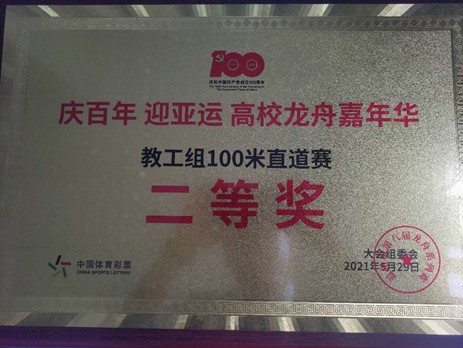 选手们在比赛中伴着铿锵有力的鼓点在碧波荡漾的明心湖上尽情挥洒着汗水,乘风破浪、奋勇向前,最终斩获教工组100米直塞道二等奖的好成绩。