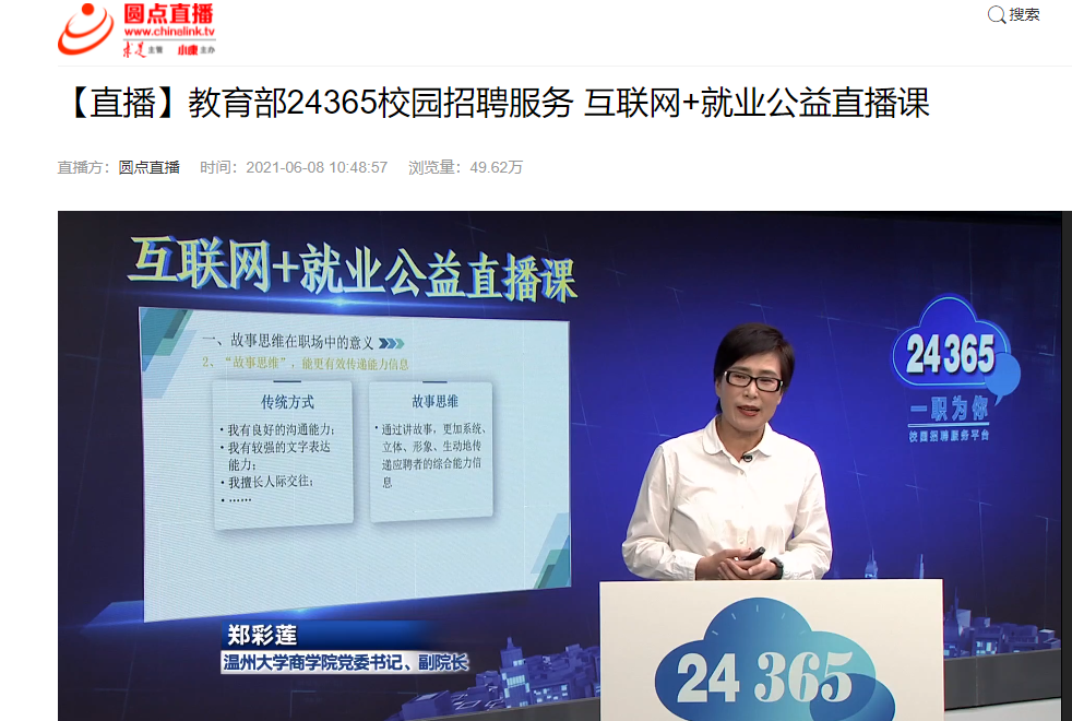 党委书记郑彩莲教授以就业创业指导专家身份受邀做客中国教育电视台,主讲“训练‘故事思维’·为职场赋能”教育部24365互联网+就业公益直播课。