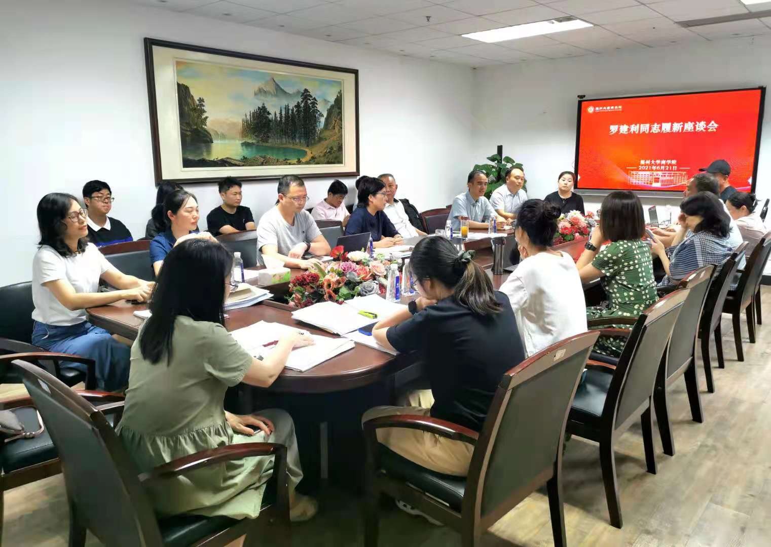 2021年6月21日上午,商学院召开欢送罗建利同志履新座谈会,商学院院长胡振华、院党委书记郑彩莲、副院长余向前、院长助理徐正及各科室主任、各支部书记及相关人员参加座谈会。座谈会由学院党委书记郑彩莲主持。