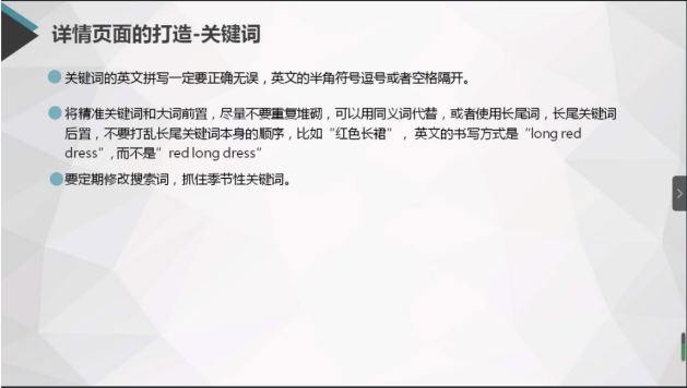 详情页面对于商品销售极为重要,那么我们该如何进行详情页面地撰写呢?庄老师介绍道:详情页面主要包括标题、图片、五行描述、关键词优化,每一项都有相关注意事项和具体要求,要注重产品特性和同行信息。