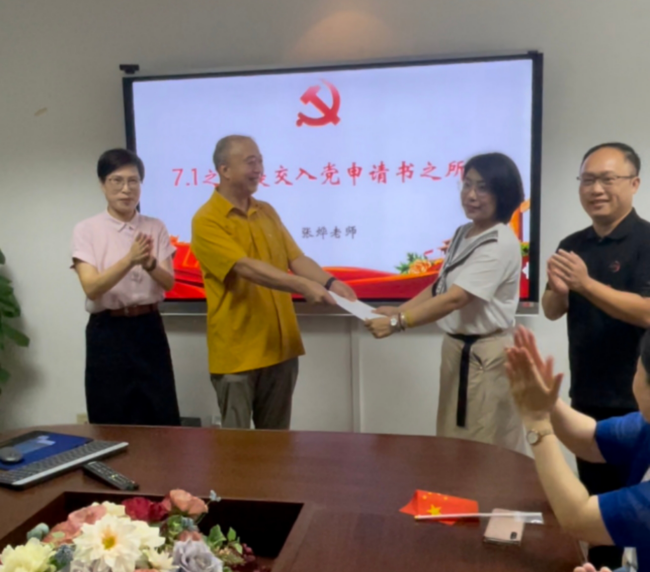 在观看直播前,商学院财务管理系系主任、青年博士张烨老师在大家的见证下郑重地向党组织递交了入党申请书。她说,此前,虽然不是党员,但多次感受到学院与系里的党员活动氛围,置身其中,才能理解这个优秀的集体在如何调动每个人的能动性,为国家发展建言献策。特别是疫情之后,更加坚定了自己向党组织靠拢的决心。因为觉得特别有意义,所以也就特意选择在今天递交入党申请书。