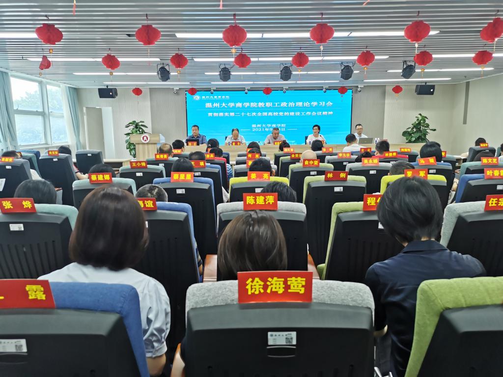 第二十七次全国高校党的建设工作会议17日在京召开,为贯彻落实会议精神,扎实推进学院党的建设和思想政治工作。2021年9月8日上午,商学院在信息楼A226仲辉商道讲堂召开教职工理论学习大会学习第二十七次全国高校党的建设工作会议精神。全体教职工参加学习会,会议由学院党委书记郑彩莲主持。