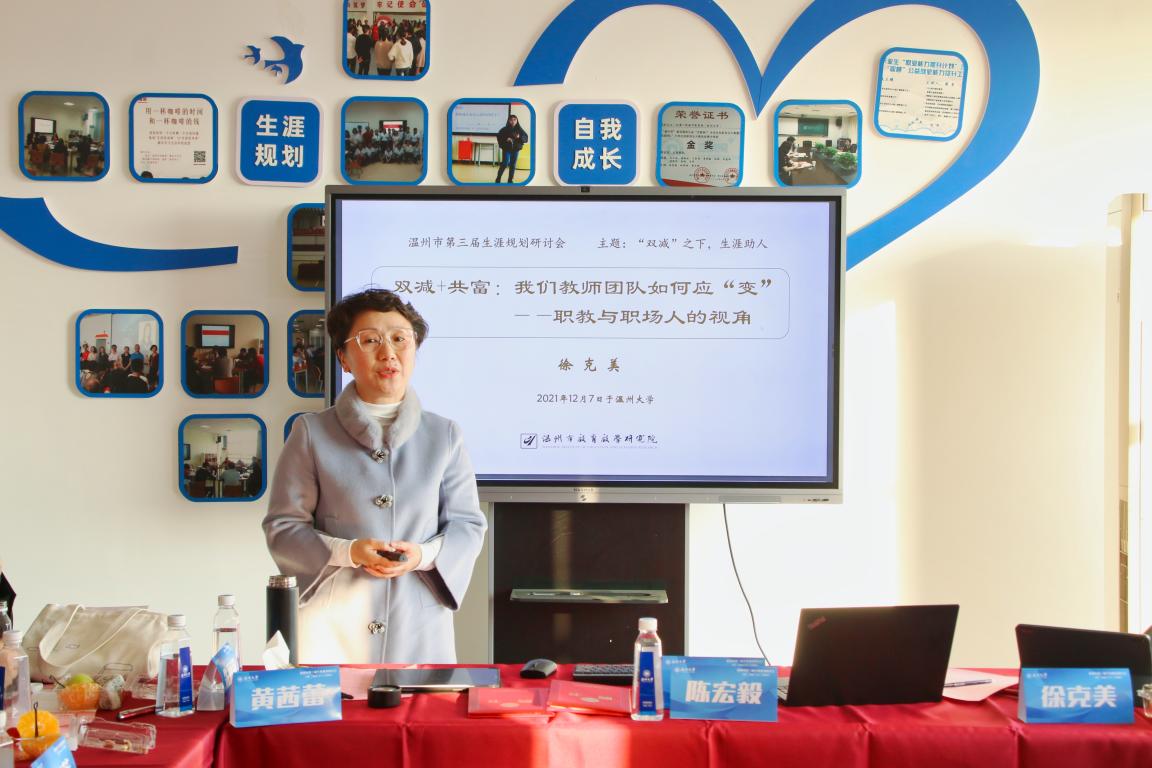 在主旨汇报与交流研讨阶段,温州大学音乐学院党委书记朱启鑫围绕《生涯教育的课堂探索和个人实践》进行发言,朱书记强调鼓励学生并不是鼓励他的成绩,而是他的状态,所有的努力,让学生成长为他们想要的样子——做自己;温州大学校友与发展联络办主任陈宏毅聚焦《MBTI在职业生涯中的运用》进行阐述,并且就具代表性的性格进行了分析,认为“双减”之下,内驱力和自我管理能力,成为核心竞争力;温州市第八高级中学高级教师黄茜蕾在题为《双肩背景下学生学习共同体的实践与思考》发言中依据恩格斯托姆活动理论制定假期学习社群的实施路径,并利用可视化成果和多元化激励机制来对假期学习社群的成效进行反思;温州市教育教学研究院教授徐克美结合自己的独特视角,在题为《双减+共富:我们教师团队如何应“变”—职教与职场人的视角》的发言中指出,社会巨变波及我们每一个人,影响着我们的时间、方式、地点和原因,进而影响我们对职业生涯的规划及追求。应对“双减”的改变是为了更好应变才能够变得更好,打破行业、校际、学段和学科的隔阂,教师才能真正体验职业的幸福感。