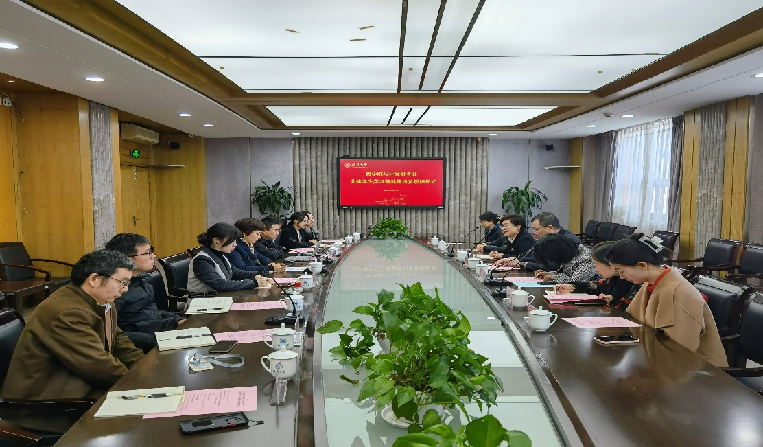最后,商学院余向前副院长与计财处任瑞璋副处长在友好的气氛下签署实习基地建设协议书,并由郑彩莲书记向陈小敏处长进行基地授牌。参会全员合影留念,此次仪式圆满结束。