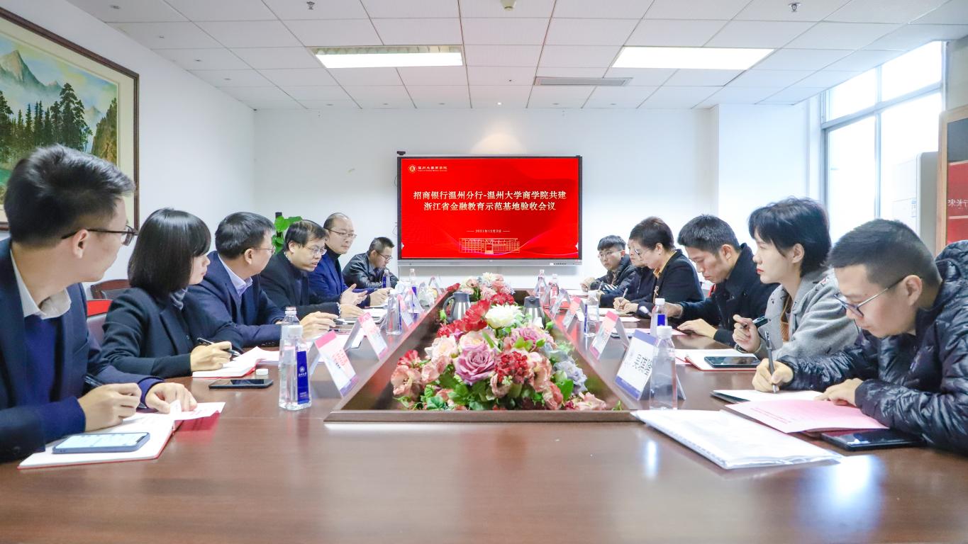 参观完金融教育示范基地,随即在学院会议室举行了验收会议。商学院党委书记郑彩莲致欢迎辞。郑书记向与会领导介绍了温州大学和温州大学商学院的基本情况,表示温州大学是浙南闽北赣东唯一的综合性大学和博士点授予单位,温州大学商学院是学校规模最大和最有实力的学院之一,金融工程专业是国家一流专业建设点,招商银行与学院联合筹建省级金融教育示范基地有良好合作基础和发展潜力。招商银行温州分行办公室主任陈时蔓和中国人民银行温州市中心支行办公室主任李峰分别介绍了基地建设规划和基地验收流程。校保卫处副处长钱合激代表学校职能部门表达了对基地建设的关心和支持。招商银行温州分行副行长李永恩代表招行表达了对基地建设的期望和愿景,希望省级金融教育示范基地能充分发挥各方优势,让金融教育制度化、常态化和可持续化,真正做到普惠金融、服务社会。