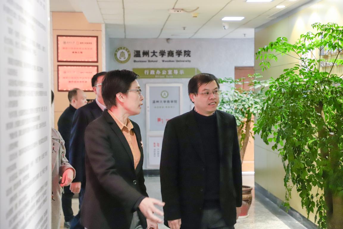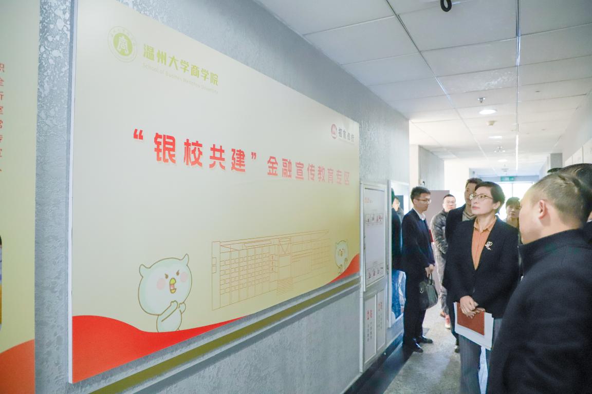 12月2日,中国人民银行温州市中心支行宋征威副行长、办公室主任李峰等一行实地察看了由温州大学商学院和招商银行温州分行共同申报的省级金融教育示范基地建设情况,并召开了验收会议。参加验收会议的还有招商银行温州分行副行长李永恩、办公室主任陈时蔓等。一行人首先来到位于温大北校区二楼北面的金融教育宣传专区(金融教育文化长廊),听取了温大商学院“银校共建“情况介绍。得知商学院通过党员金融公益宣讲团对高校大学生进行常态化金融宣讲后,宋行长表示,金融教育需要解决有效性和长效性问题,基地将金融教育融入党员教育管理,确保了金融教育的可持续性,弥补了银行人力的不足,做法非常好。