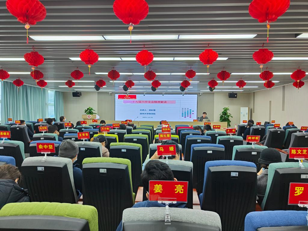 2021年12月15日,商学院在A226仲辉商道讲堂举行全体教职工理论学习大会,深入学习贯彻党的十九届六中全会精神,学院党委书记郑彩莲领学。
