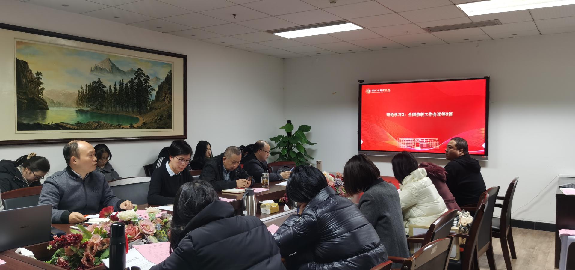 唐华副书记领学了全国宗教工作会议等8篇理论学习材料。习总书记在全国宗教会议上强调要坚持我国宗教的中国化方向,积极引导宗教与社会主义社会相适应,必须要建立健全强有力的领导机制,构建积极健康的宗教关系。唐华副书记强调,作为高校教师,我们必须要坚持教育与宗教相分离的原则,必须要加强对学生马克思主义宗教观的教育与培养。
