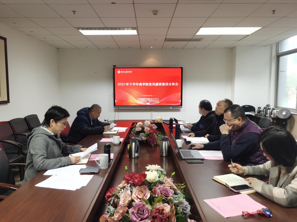 会上,唐华同志介绍2021年下半年商学院党风廉政建设工作总体情况;紧接着,每位班子成员汇报了职责分工范围内的党风廉政建设情况,重点研究存在的问题及整改措施。