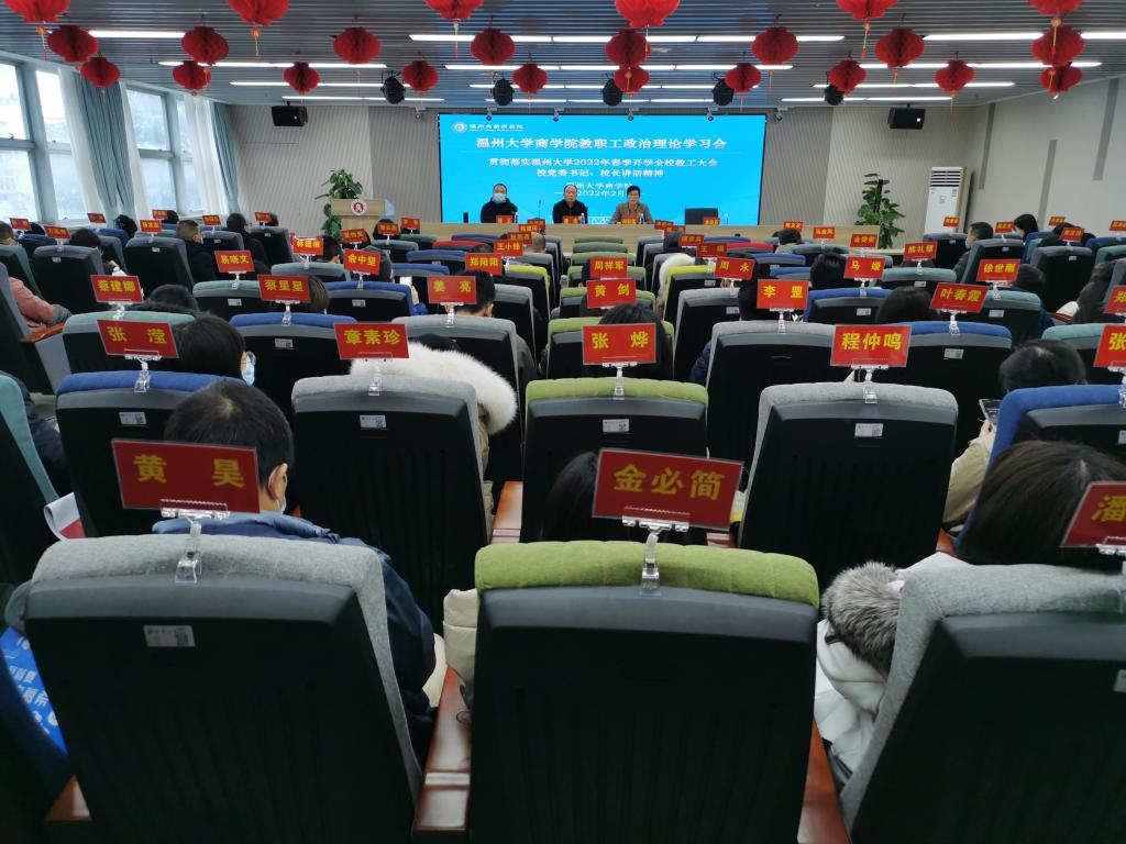 2022年2月23日下午,商学院在商院楼A226仲辉商道讲堂举行2022年春季新学期教职工理论学习大会,切实提高政治站位,认真贯彻落实谢树华书记、赵敏校长在2022年春季新学期全体教职工大会上的讲话精神。全体教职工参加学习会,会议由学院党委书记郑彩莲主持。