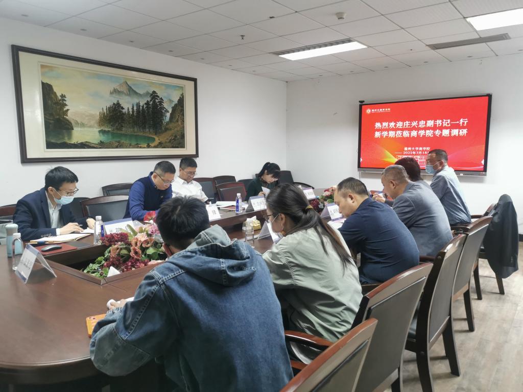为进一步深化改革、完善治理,激发“学院办大学”的内生动力,推动学校高质量内涵式发展,2022年3月18日,校党委副书记庄兴忠莅临商学院开展新学期“五个一”专题调研,以走进教室听课、召开教师座谈会、参加学院领导班子工作讨论会、与学生进行明心餐叙等形式深入学院了解办学情况与师生需求。校招生与就业处、团委、学生工作部等部门相关负责人陪同调研。