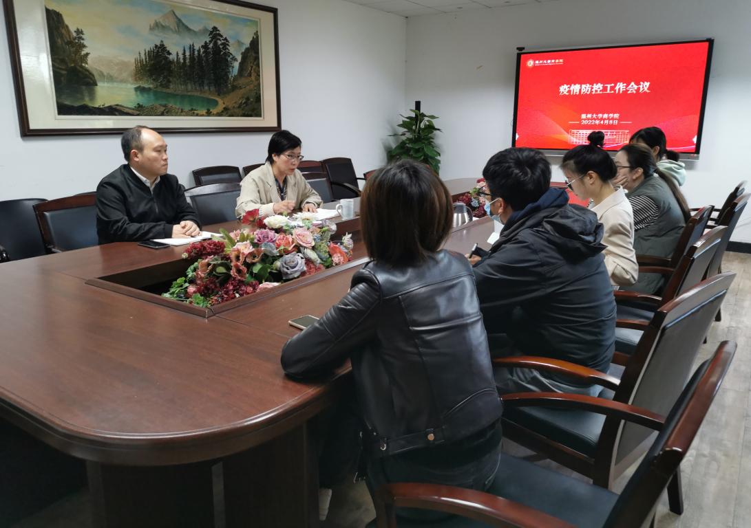 为进一步做好学院疫情防控工作,2022年4月8日,商学院举行疫情防控工作会议,会议由学院党委书记郑彩莲主持,学院党委副书记唐华、办公室主任张素琴、教学科科长徐姝、学生科科长周洁文及相关工作人员参加会议。