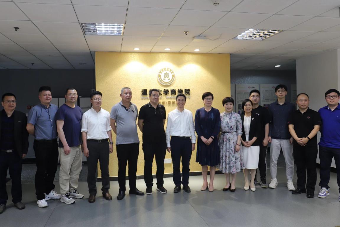会议开始前,郑彩莲书记邀请商务局的领导们到715直播间进行实地考察。陈济庆董事长向在场领导介绍715直播间这个为学生提供实操平台的实操培训班。接着,郑书记带领大家来到二楼长廊,向大家介绍了温州大学商学院的四个专业和师资队伍,展示了走廊墙上优秀校友的贡献,在校友活动中追溯跨境电商的悠久历史。