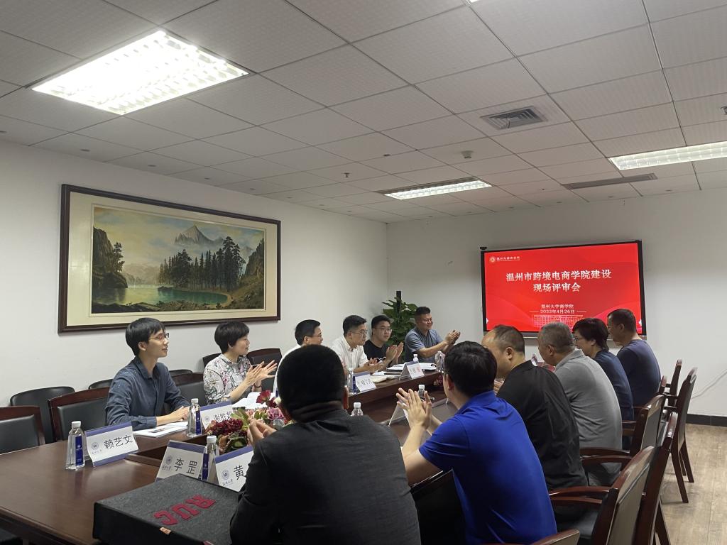2022年4月26日下午,温州市商务局副局长楼了凡、温州市商务局跨境电商综试区处副处长钱俊、温州市商务发展促进中心主任龙佳丽莅临温州大学商学院,对温州市跨境电商学院建设进行现场评审。出席现场评审会的还有温州大学商学院院长胡振华、副院长余向前、党委书记郑彩莲、党委副书记唐华、物流专家博士方嘉奇、国贸系专家博士黄剑、温州大学瓯江特聘教授李罡、温州大学715思政直播间负责人和温州康晶光学有限公司董事长陈济庆。本次会议由温州大学跨境电商学院院长林俐做汇报工作。