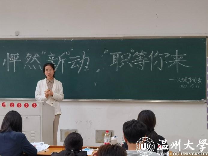 2022年5月15日下午,人力资源协会HR模拟面试活动在温州大学北校区第二教学楼401教室顺利开展。来自宁波银行温州分行的HR徐寒冬小姐和温州大学商学院的李慧慧老师受邀作为主要的面试官,对参赛选手进行提问和评价,并在活动的最后分享了面试相关的知识和经验。