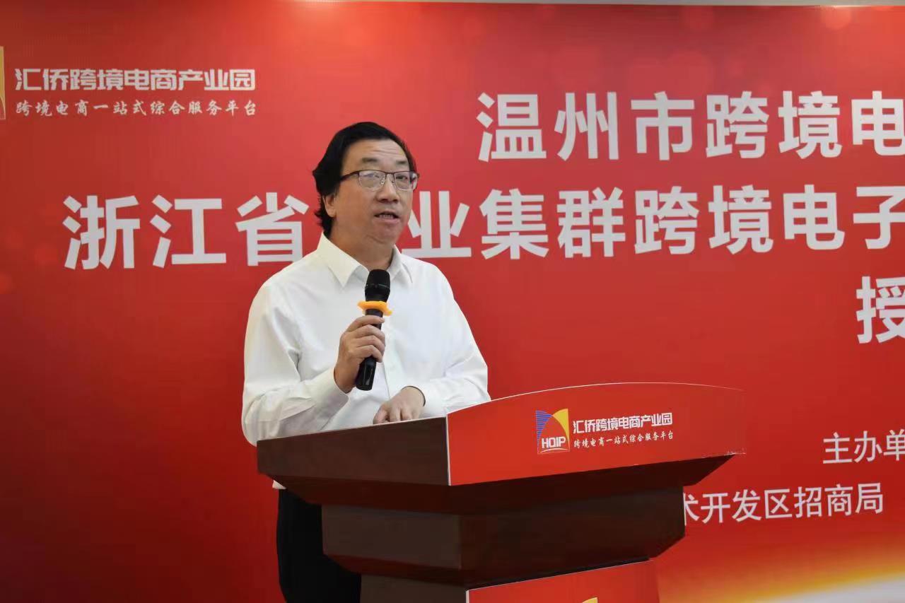 仪式上,为乐清市电器、苍南县针织内衣、龙港市礼品、经开区五金卫浴等获批浙江省第三批产业集群跨境电商发展试点单位及入选第二批温州市跨境电商学院建设单位的三所院校授牌。温州大学与汇侨(温州)跨境贸易服务有限公司、创星(温州)企业服务有限公司分别签约合作,共建跨境电商学院。经开区商务局局长郑季林代表第三批产业集群跨境电商发展试点单位分享争创经验,中国电子温州产业园总经理蒋朝红分享校企合作成功经验。