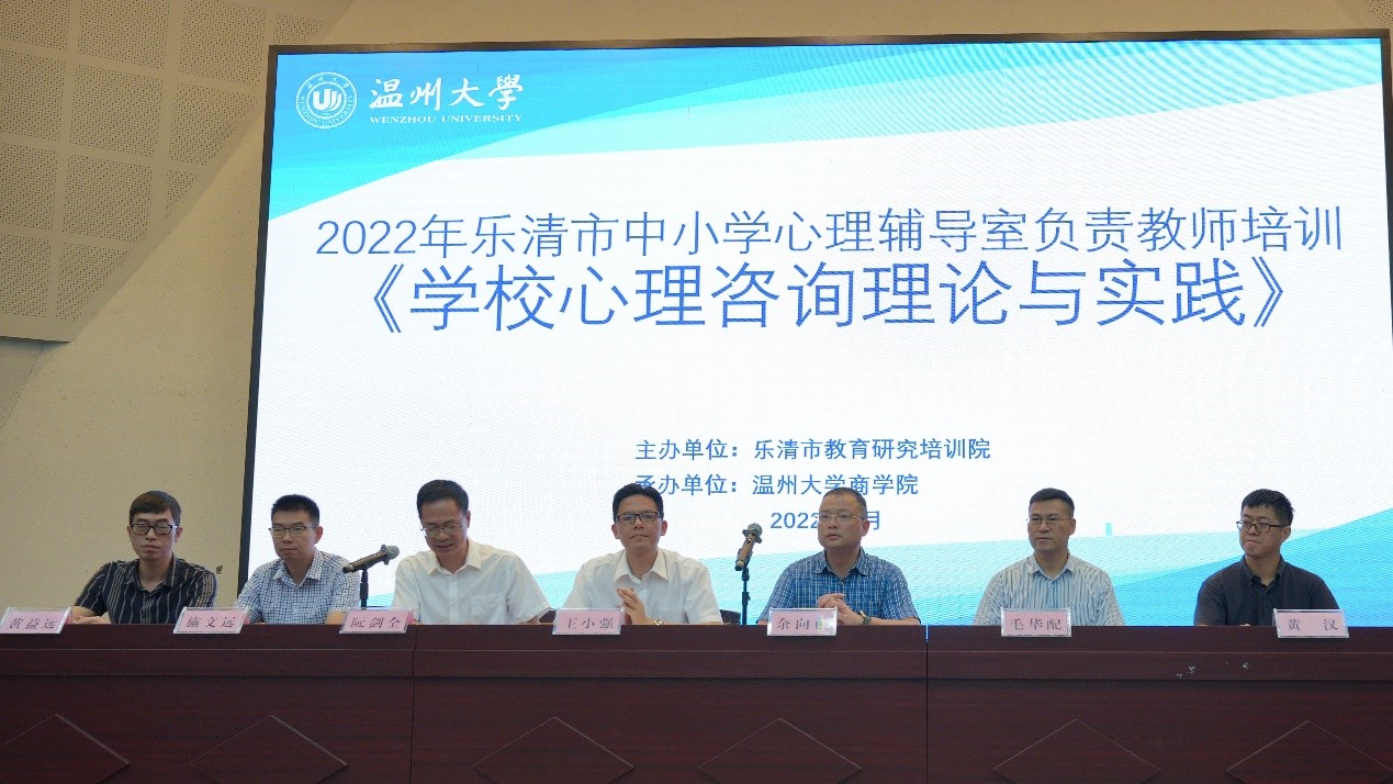 8月11日上午,由乐清市教育研究培训院主办,温州大学商学院承办的乐清市中小学心理辅导室负责教师培训《学校心理咨询理论和实践》开班仪式在温州大学南校区9号楼报告厅举行。本次活动由乐清市教育局学生科副科长阮剑全主持,乐清市教育发展中心主任王小强、乐清市教育局学生科副科长阮剑全、乐清市教育局学生科干部施文远、乐清市教育研究培训院心理研训员黄益远、温州大学商学院副院长余向前、温州大学商学院金融系副教授毛华配出席了活动现场,来自乐清市150位中小学心理辅导室负责教师参加了活动。