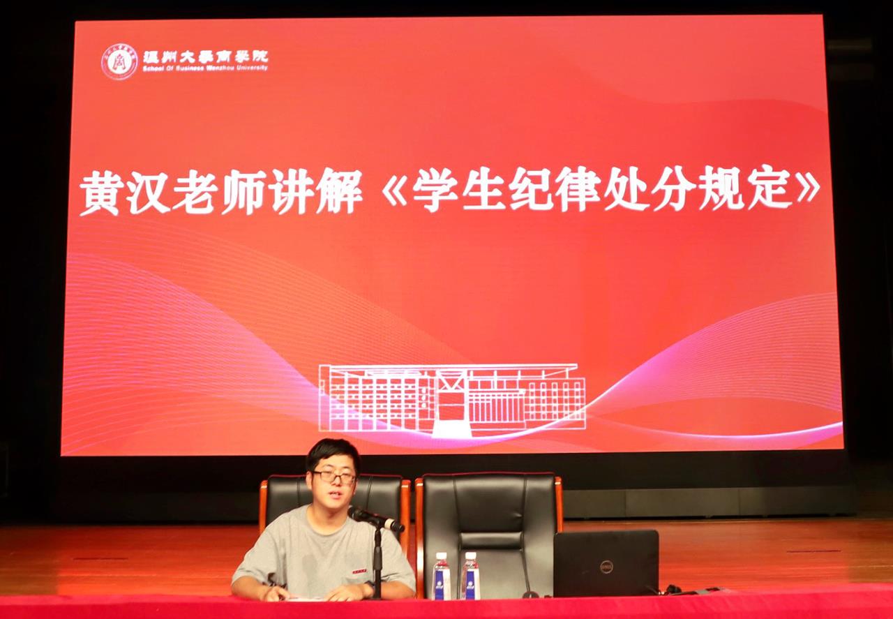 辅导员黄汉着重强调《温州大学学生纪律处分规定》是《学生手册》的重要组成部分,是对学生行为进行约束、管理、处罚的重要依据之一,每一位入学新生都应该准确理解《学生纪律处分规定》的各项规定。接着,黄老师带领新生学习手册规定相关重要内容,并且详细介绍了学生纪律处分流程、解除处分流程,纪律处分常见的问题和注意事项。最后,黄老师还介绍了学院考研相关工作,学院一直高度重视应届毕业生考研工作的开展,在思想、学习和生活等多个方面为考研学生提供指导和帮助,并通过打造“考研样板间”的示范效应在学生中积极营造浓郁的学习氛围,推进学院优良学风建设。