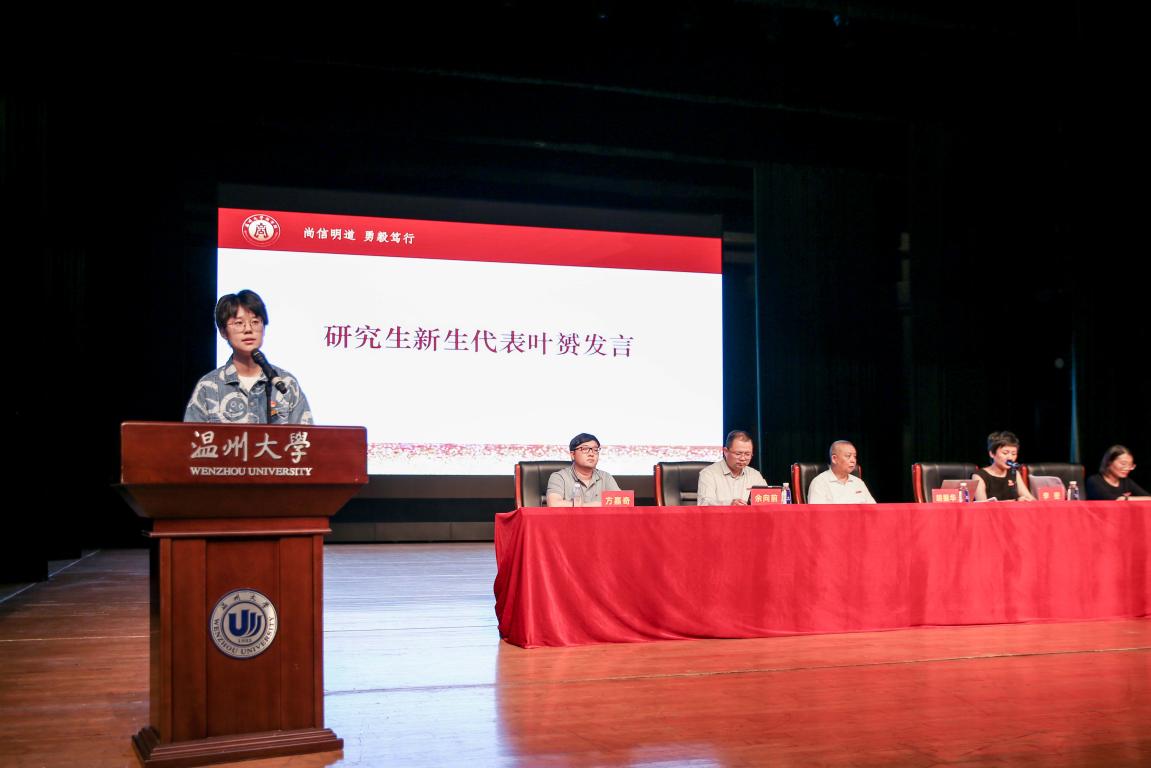 22金融专硕研究生叶赟作为研究生新生代表发言。举目而望,回眸历历,她回望过去的大学四年,挥洒过无尽汗水和青春,此刻和在座的各位新同学缘聚温大。新起点新征程,她将继续上下求索,书写崭新篇章。踔厉奋发,未来长鸣。她提到,作为00后的我们成长于一个最好的时代,作为一名新时代研究生新生,理应坚定四个自信、做到两个维护,保持一往无前的奋斗姿态和风雨无阻的精神状态,续写新的辉煌。