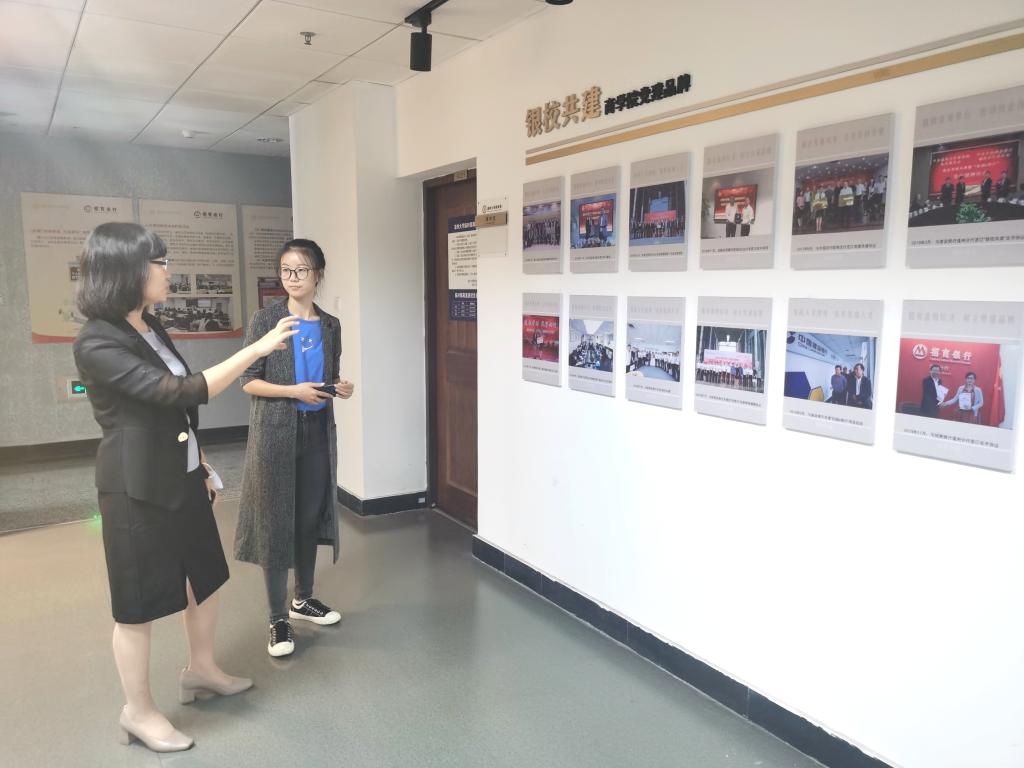 在学院党委秘书聂海燕的带领下,李珺行长等一行参观了商学院金融教育宣传直播间、金融教育文化长廊,从中了解了浙江省金融教育基地申报及创建的基础和前期筹备工作。