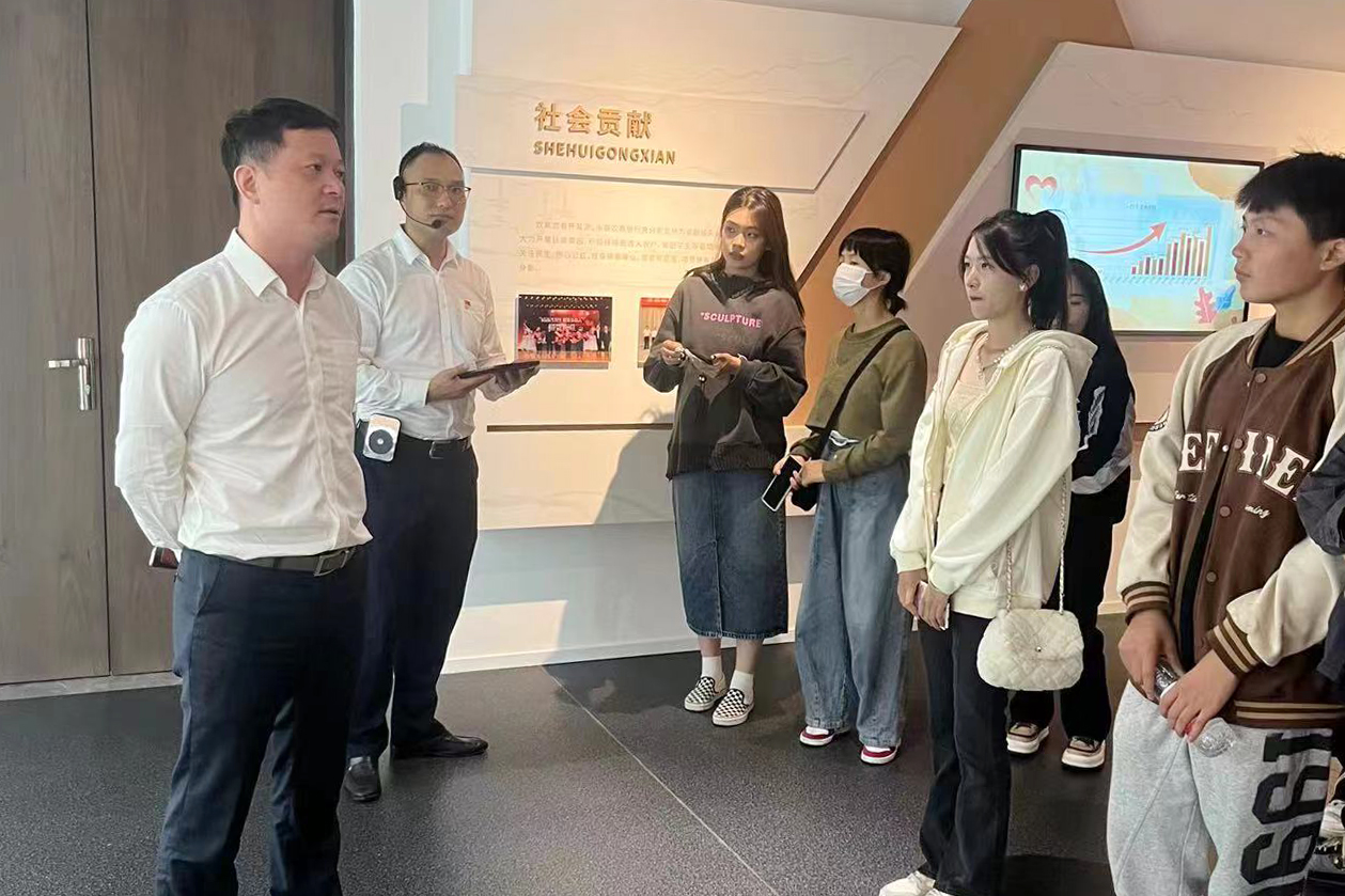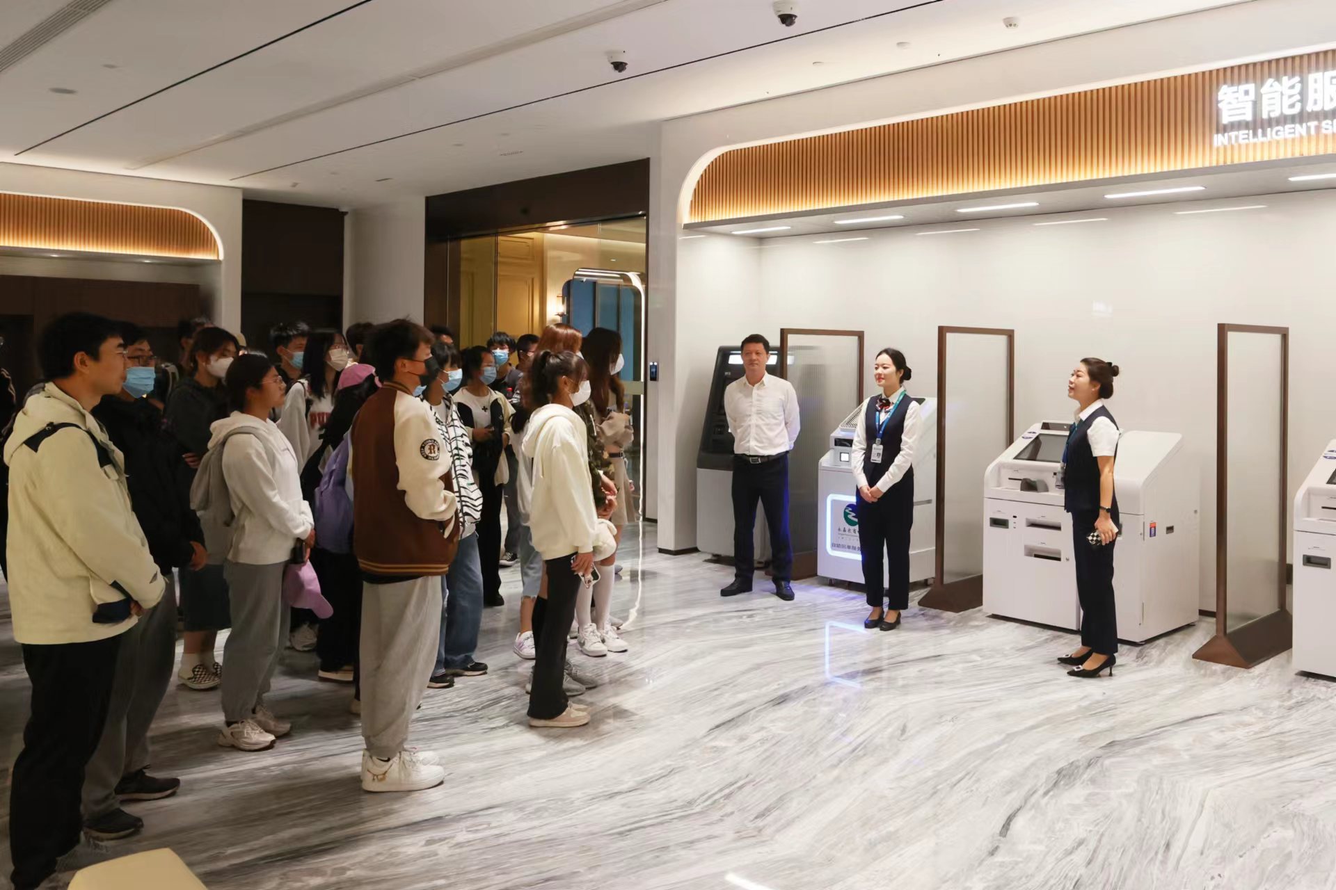 永嘉农商银行总部大楼外部观感高大简洁,上部23层,下部2层的高度设计,恰如其扎实守本心,意欲展宏图的决心。作为一栋综合性大楼,1楼为智能服务与银行业务办理地,专业及其现代化的讲述让学生们体会到银行的业务与创新。