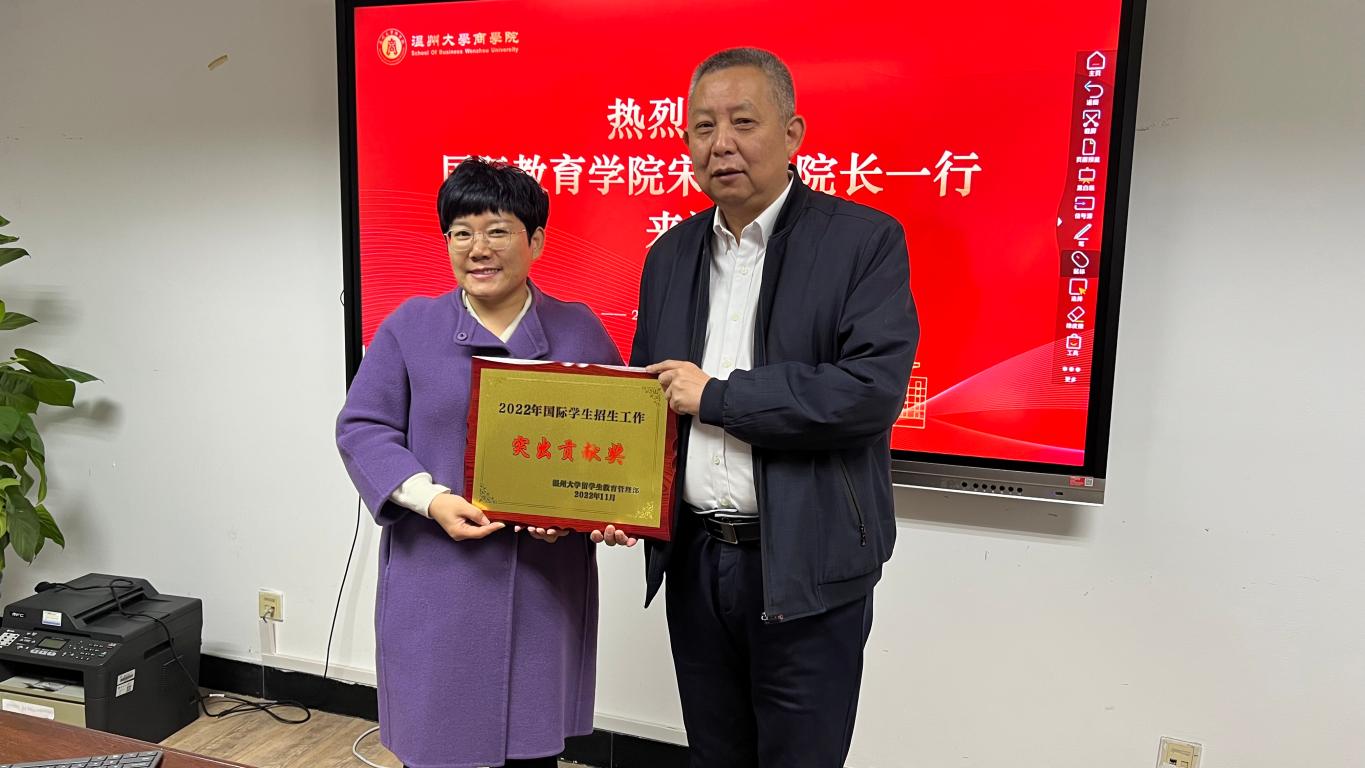 会上,首先由熊勇副院长向与会人员汇报2022年我校国际生招生情况。熊院长指出,在疫情形势多变的情况下,留管部与各个学院多措并举、多管齐下,扎实推进招生工作,取得了显著成效,2022年共报到留学生超300名,其中商学院报到学生占比超18%,为全校之首。熊院长对商学院在招生工作方面的配合与支持表示感谢。随即,宋占美院长宣布商学院荣获“2022年国际学生招生工作突出贡献奖”;应用经济学(留学生)硕士点负责人王露老师荣获“国际学生招生工作先进个人”荣誉称号,并在与会现场举行了颁奖仪式。