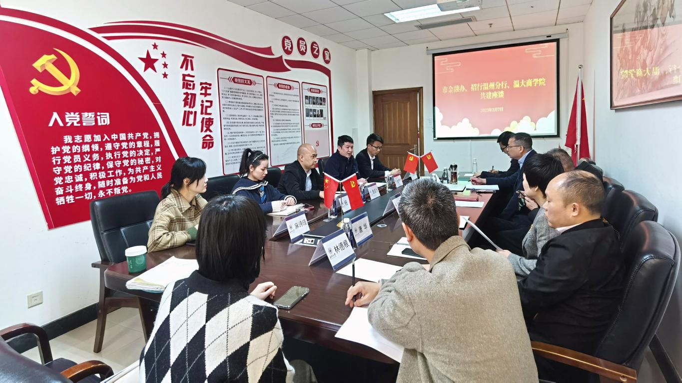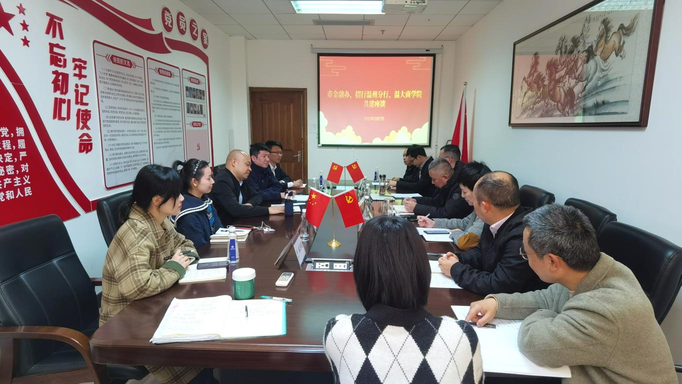詹昌为处长从业务培训、课题研究、智库支撑、金融研讨和主题活动五个方面详细介绍了三家单位拟联合筹备教育基地工作的计划安排。他提出,市金融办将与温大商学院、招商银行温州分行展开更加密切的合作,为教育系统提供更专业的金融服务。刘斯时总经理介绍了招商银行温州分行在履行社会责任中所作出的突出贡献。他指出,招商银行温州分行崇尚于社会服务,积极履行社会责任,在进校园宣传方面,主要完成了非法集资防诈、安全用卡、个人信息保护、投资者教育和金融知识普及等工作。招商银行温州分行将继续扮演好金融教育参与者和共建者的角色,积极参与金融知识宣传,共同守护良好的金融环境。招行温州分行团委书记潘道品主要介绍了教育基地更新推广和授牌仪式的工作计划。针对教育基地更新推广,他提出金融办要将温州防范非法集资教育作为主要的推广示范点,实现多维度融合。