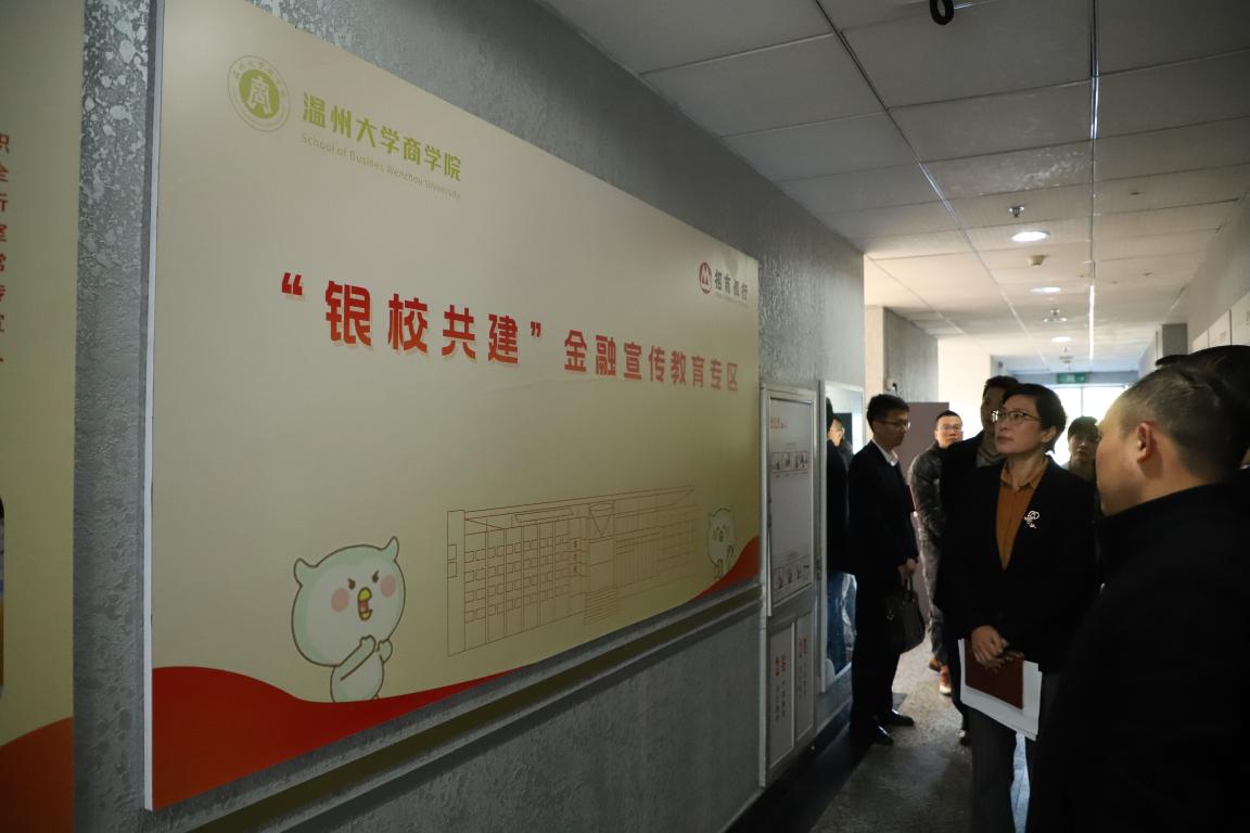 12月2日,中国人民银行温州市中心支行宋征威副行长、办公室主任李峰等一行实地察看了由温州大学商学院和招商银行温州分行共同申报的省级金融教育示范基地建设情况,并召开了验收会议。参加验收会议的还有招商银行温州分行副行长李永恩、办公室主任陈时蔓等。一行人首先来到位于温大北校区二楼北面的金融教育宣传专区(金融教育文化长廊),听取了温大商学院“银校共建”情况介绍。得知商学院通过党员金融公益宣讲团对高校大学生进行常态化金融宣讲后,宋行长表示,金融教育需要解决有效性和长效性问题,基地将金融教育融入党员教育管理,确保了金融教育的可持续性,弥补了银行人力的不足,做法非常好。
