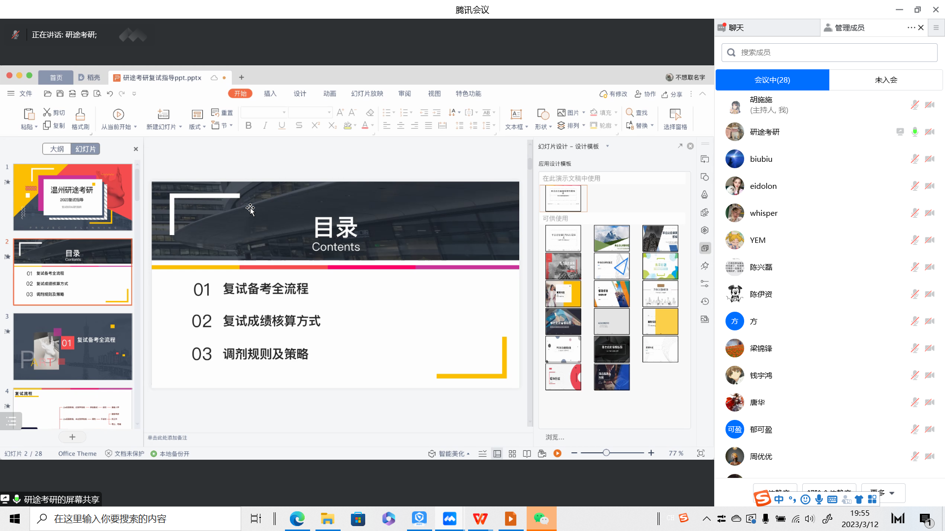 以腾讯会议的方式顺利召开2023届考研复试指导暨经验分享会。本次会议邀请了学院党委副书记唐华、5名研究生学长学姐以及研途考研师璇慧老师进行复试经验分享与交流,2023届考研学子线上远程参会,会议由学生科胡施施老师主持。