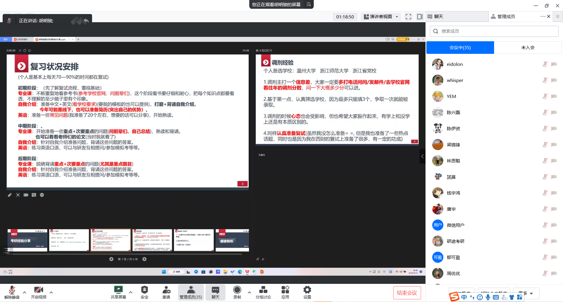 研究生林思聪、胡明骏五名学长学姐依次作经验分享。他们从自身考研经历出发,围绕复试内容、复试方法、复试细节以及调剂技巧等方面分享了复试策略。特别提醒同学们在面试时注重着重礼仪,在分享考研复试经验之外,另外,在得到考研复试时间消息后建议同学们要及时预定相关行程车票和住宿安排。