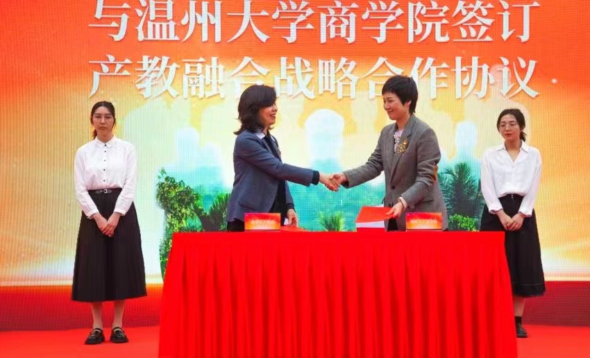 在仪式上,双方签订了产教融合战略合作协议。温州大学商学院以浙江省一流专业工商管理为主要依托,与温州设计集团将在党建品牌创建、企业管理咨询、薪酬体系调研、人才招聘服务、人力资源培训等方面展开紧密合作,共建人力资源特色党建品牌、人才联合培养机制、温州市国资国企改革发展研究课题组和研究生联合培养基地。