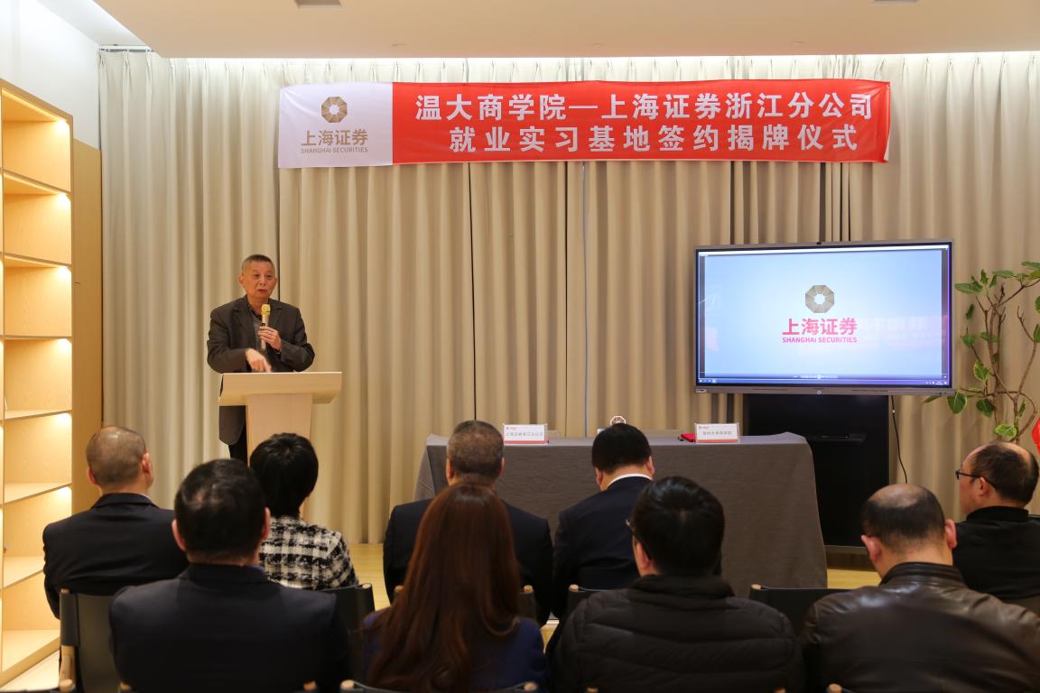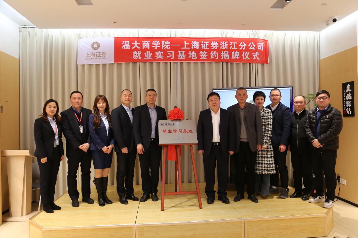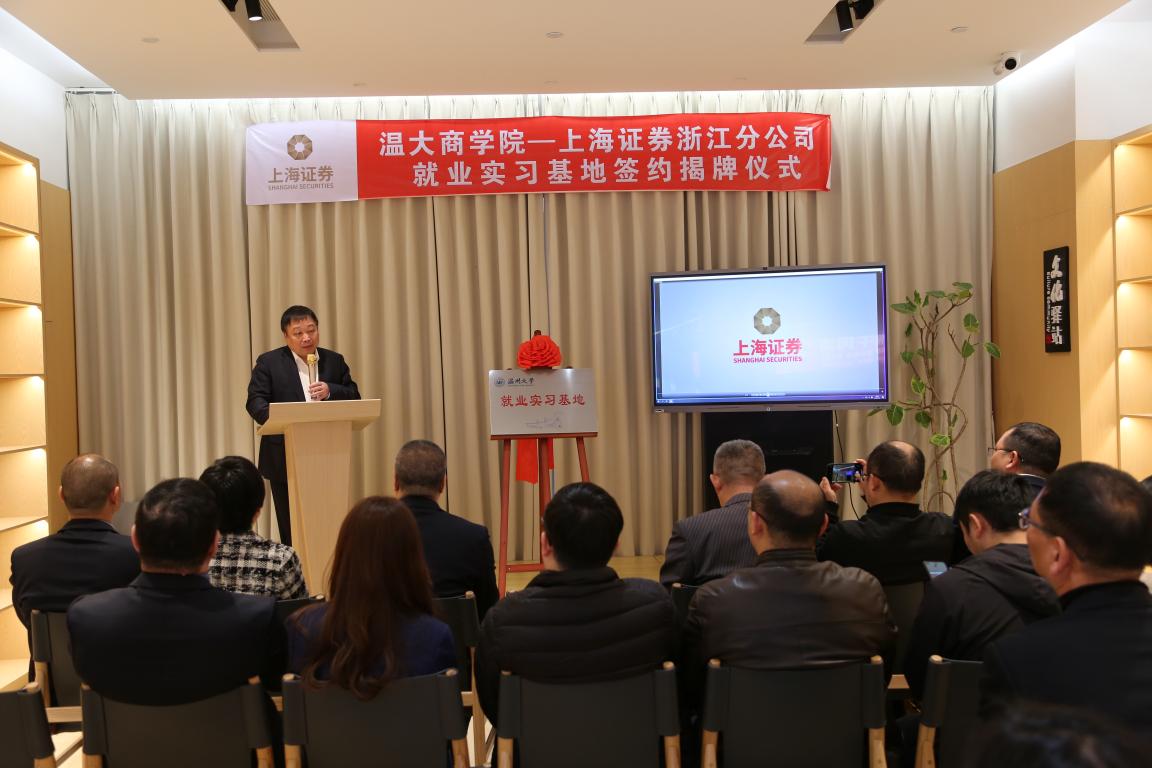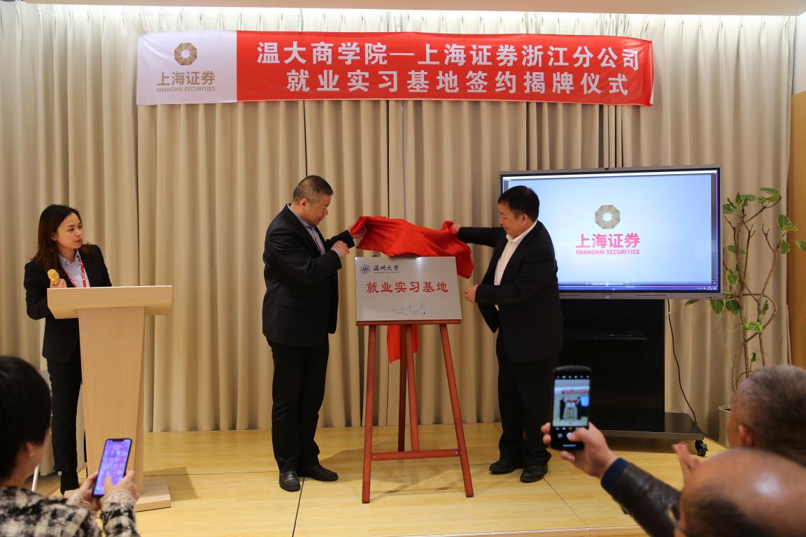 商学院党委书记李密与上海证券浙江分公司副总经理蔡晓敏一起签约了温大商学院—上海证券浙江分公司就业实习基地协议书,现场由校长赵敏和上海证券浙江分公司总经理金洛川一起举行了揭牌仪式。