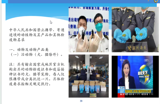 下半场是国门生物安全讲座。高老师先给同学们展示了海关工作人员工作的概况,介绍了海关的职能:检验检疫、缉私、缴税、统计等。之后,高老师着重讲解了检验检疫相关方面的知识。海关人员要关注入侵生物,如红火蚁、食人鱼等,还要预防疾病病毒的传播,如疯牛病等。最后,他介绍了我国入境禁止携带的部分动植物、产品和其他检疫物,让同学们收获了不少新的知识。整个讲座,高老师认真却不失诙谐,讲解绘声绘色,师生互动良多,氛围和谐。