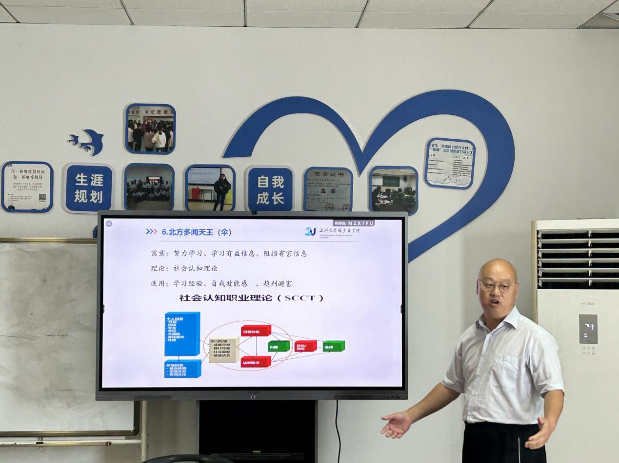 温州大学苏步青学院党委书记、生涯教育研究中心副研究员应中老师以《无声的聩响:佛教雕塑中的生涯教育》为主题介绍了了各个文化体系的信仰目标,如伊斯兰教爱好和平,墨教追求兼爱、非攻,佛教讲究自觉和觉他。他提到“为中国人民谋幸福,为中华民族谋复兴”是共产党人的目标。此外,应老师还分享了佛教寺院背后所蕴含的寓意和生涯理论,例如弥勒佛脸笑肚大的形象暗示我们要随时保持一个欢喜的心态、对任何事情都要宽容,容天下难容之事。
