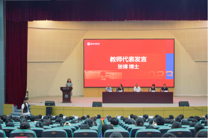教师代表张博老师以学习生涯规划为中心,围绕专业知识学习、专业外视野拓展及未来方向的展望向新生寄予希望。首先,她强调在专业学习中,要扎实基础、持续学习,生活充满机遇与挑战,只有不断提高自身实力,才能在战胜困难,把握机遇,迎接挑战。其次,在专业外视野拓展方面,个人的身体健康、兴趣爱好等构建着专业外的世界,大学丰富的社团活动、多样的公选课,都能很大程度地拓宽同学们专业外的视野。最后,在未来方向的展望方面,她指出,在大学阶段,每位同学都应深思自己的梦想,时刻鞭策自己,乘风破浪,为梦济沧海。作为新时代大学生,要肩负时代使命,将“青春小我”融入“时代大我”,胸怀天下,志存高远,顺应时代发展、响应时代召唤、展现时代担当,让青春梦想与时代脉搏同频共振,在复兴路上奋力跑出当代青年的最好成绩。