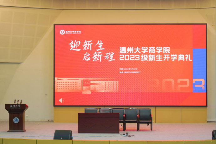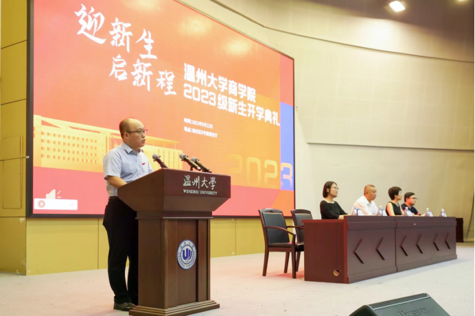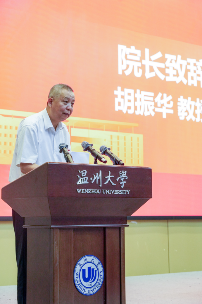 典礼伊始,胡振华院长发表致辞。今年正值温大办学90周年,商院蒸蒸日上,胡院长详细介绍了商院的具体情况,并对新生们提出三点希望。第一点,希望新生们胸怀家国,做有志气的人。爱国是个人立德之源、立功之本,深深扎根于中国人的精神谱系,教导新生们要明确自身责任与发展方向,在时代坐标系中找准自己的定位,追寻人生意义、实现人生价值。第二点,希望新生们笃学善思,做有底气的人。学习,是人类追求幸福生活的必经途径,是人立身的底气。希望新生们尽快适应大学新的学习环境,在黄金般的大学时期,发掘自己学习的潜力和动力,此外,应培养深度阅读的习惯,不断汲取古今中外人类社会数千年的智慧来丰富自身。第三点,希望新生们坚韧不拔,做有勇气的人。成大事者,愈困难,愈坚定信心,愈沉着勇毅。在这追求梦想的漫漫长路上,荆棘遍布,或许会有迷茫与彷徨,但同学们要耐得住寂寞,也要等得起花开,登顶之日,高处俯瞰,这些困难、挫折终将化为你生命的一道道风景。