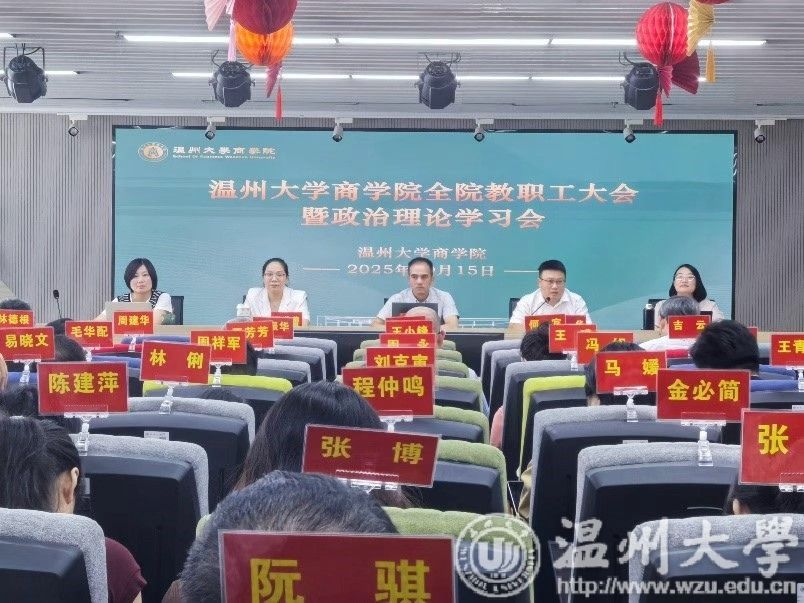 2025年10月15日下午,商学院在商院楼A226仲辉商道讲堂举行全院教职工大会暨政治理论学习会,会议由学院党委书记唐华主持,学院全体教职工参加。
