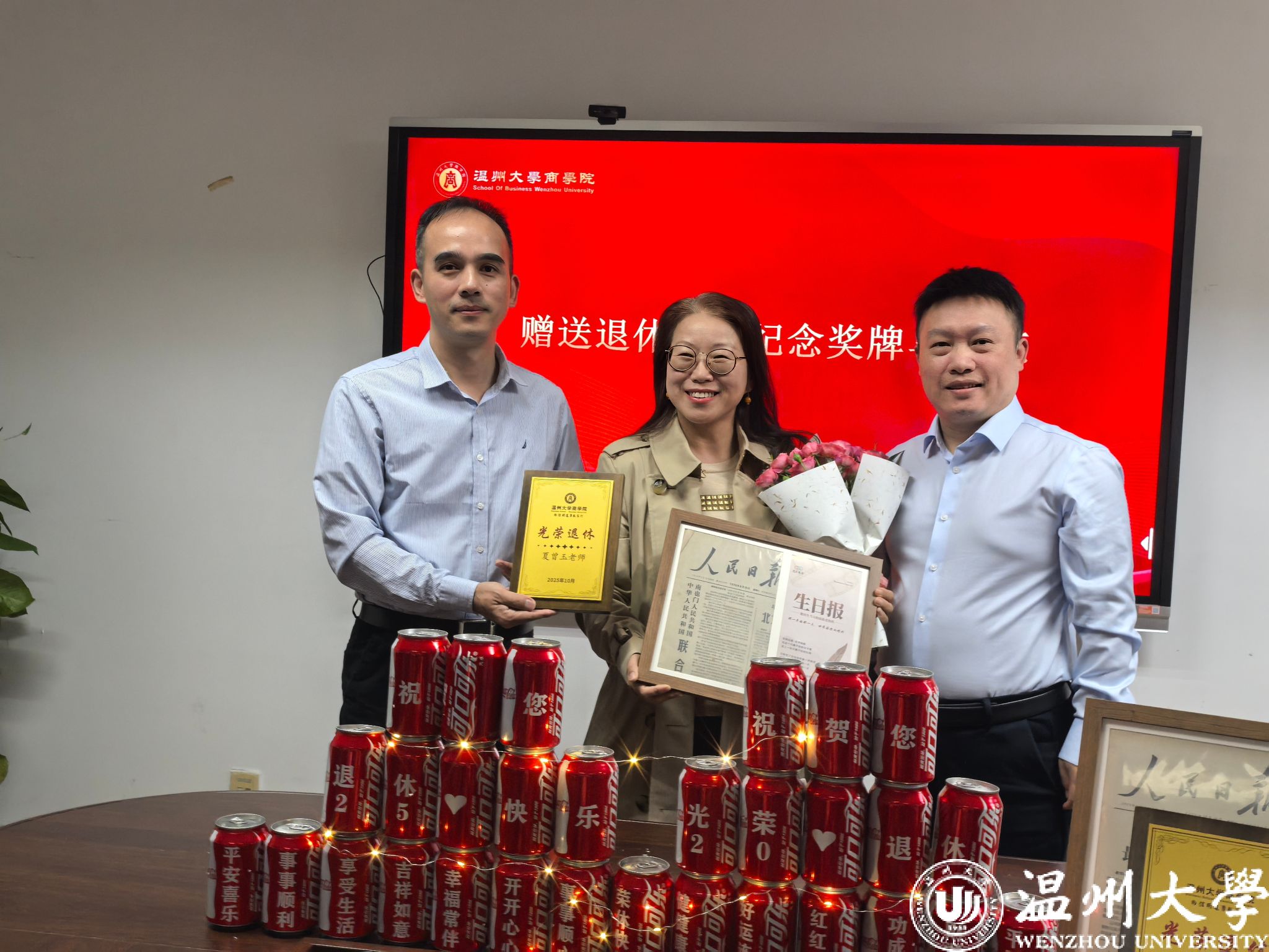 仪式伊始,全场目光聚焦于四位荣休教师——张启明老师、祝孔海老师、夏曾玉老师、沈炜老师。温州大学商学院院长罗建利、党委书记唐华代表学院,为四位荣休教师逐一献上鲜花与纪念奖牌,并赠送定制化纪念礼品。“落红不是无情物,化作春泥更护花”,荣休教师们的教育情怀与职业坚守,将成为商学院永远的宝贵财富。