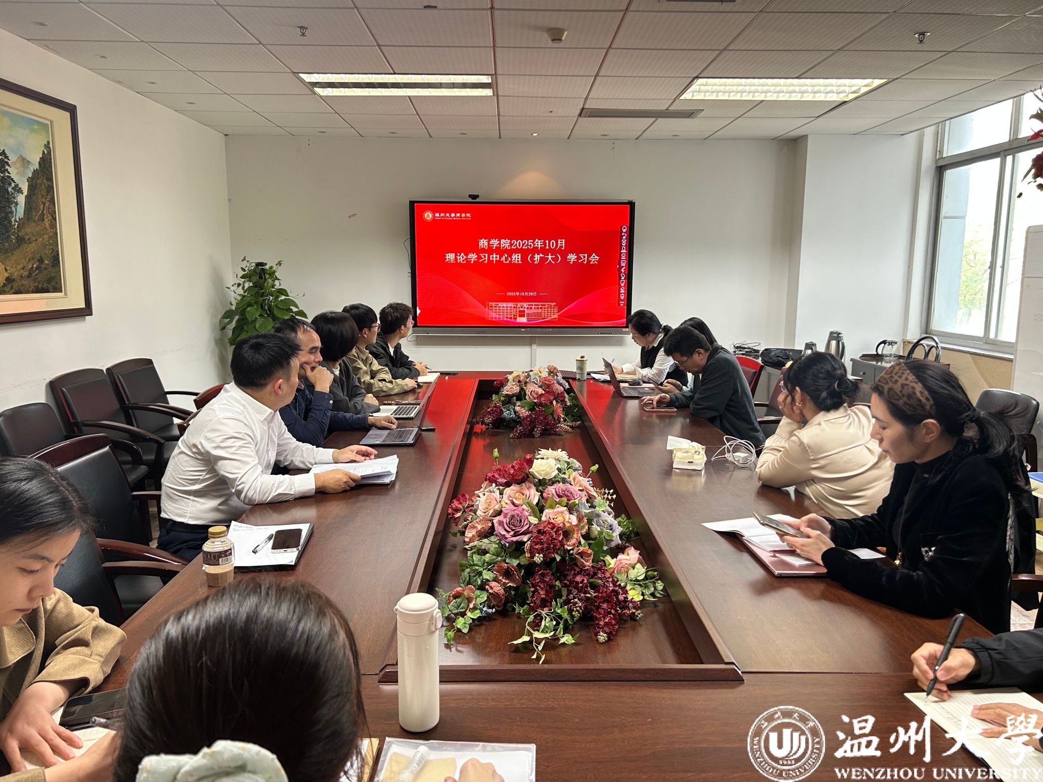 10月29日,商学院召开党委理论学习中心组(扩大)学习会,学院党委班子成员、师生党支部书记、专职组织员参加学习会。会议由学院党委书记唐华主持。