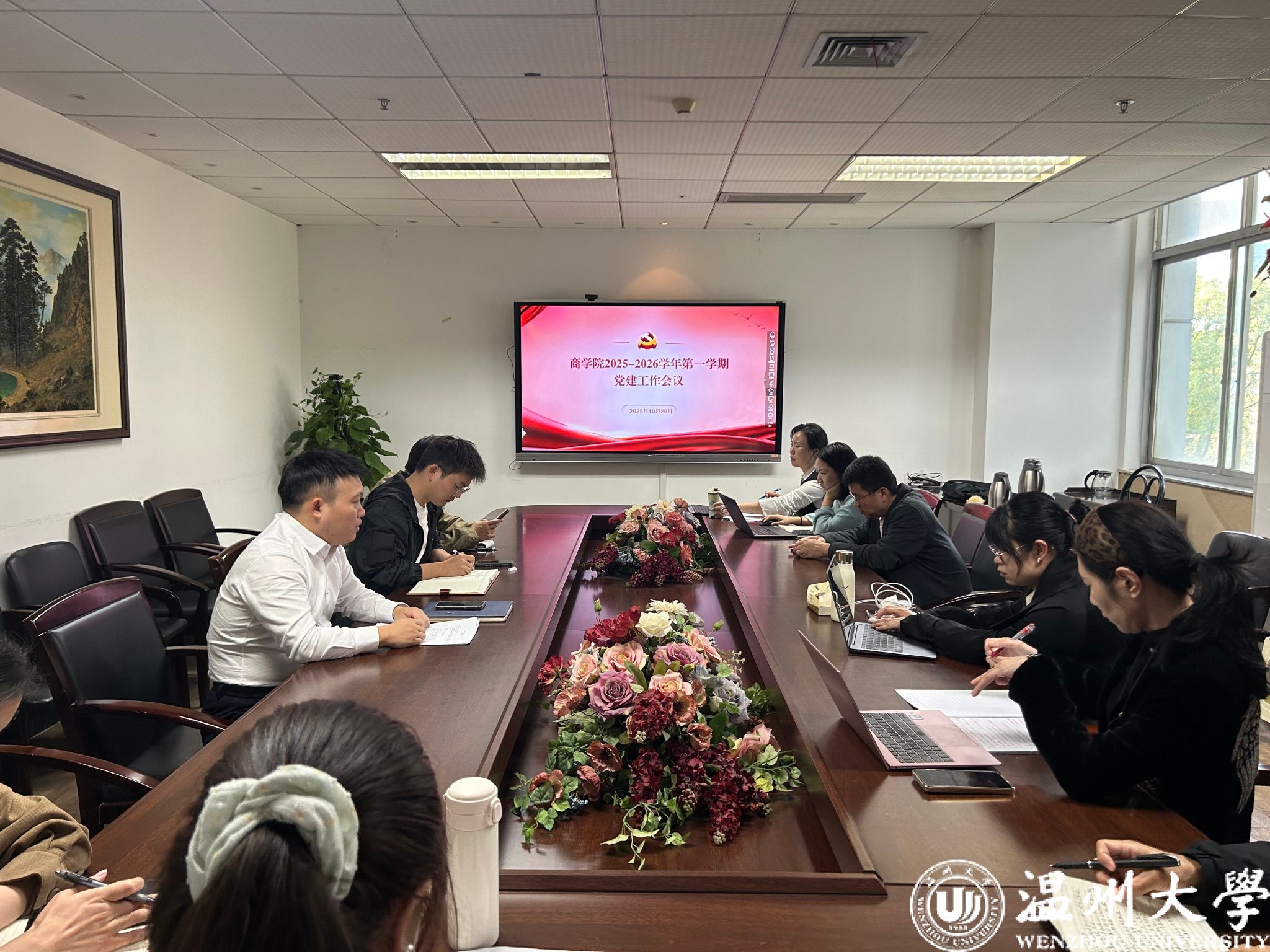唐华首先传达学习2025年秋季学校党的建设工作会议精神,并对学院本学期党建工作进行部署。他指出,本学期,学院党委工作按照“政治领航、品牌牵引、双融双促、数字赋能、勇争一流”的总要求,要强化政治建设,把“两个维护”落到商科办学全过程;要实施“支部建设跃升”行动,夯实基层组织根基;要推进“三融三促”,把党建势能转化为发展动能;要深化全面从严治党,营造风清气正“清廉学院”。同时,抓好统战、工会、共青团、离退休等“大党建”格局。他强调,全体党员要深入贯彻党的二十届四中全会精神,把党旗插在申博申硕攻坚最前沿、插在服务地方第一线、插在乡村振兴主战场,用高质量党建引领高水平学院建设,为温州大学商学院发展贡献党建力量!