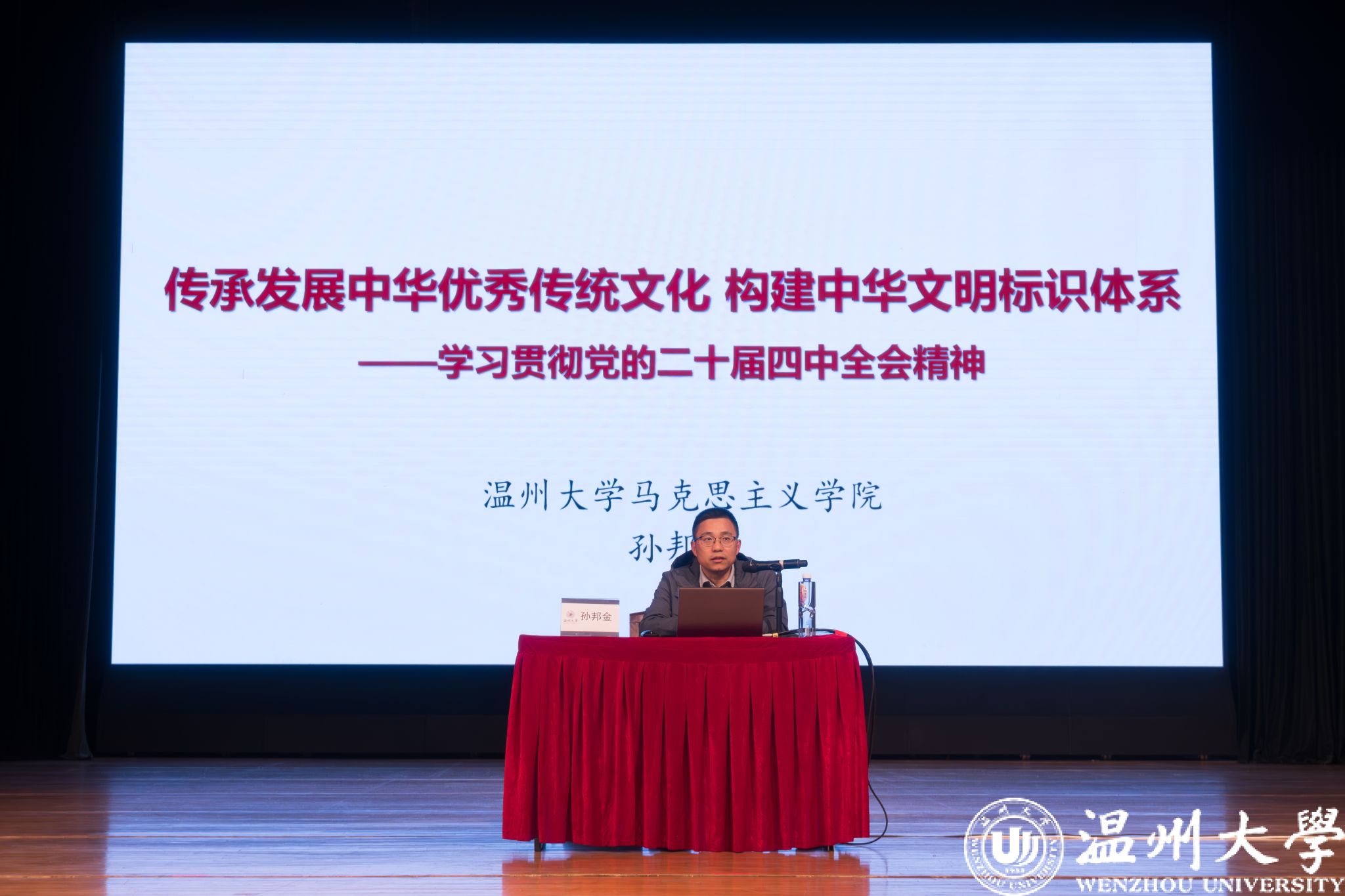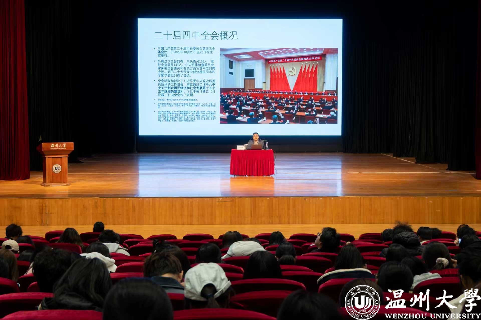 2025年12月3日晚,温州大学马克思主义学院副院长孙邦金老师应邀为学院大一、大二、大三的同学们开展形势政策专题讲座“传承发展中华优秀传统文化 构建中华文明标识体系--学习贯彻党的二十届四中全会精神”。