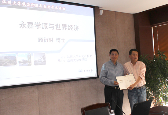 5月17日,温州大学北美校友会顾问、知名社会活动家、美籍华人顾衍时博士来校参加80周年校庆,并莅临商学院作《永嘉学派与世界经济》学术讲座。 学院党总支书记胡振华代表学校向顾博士颁发“温州大学特聘教授”证书,并介绍了学校及学院的历史变革、发展现状、特色商科等情况。顾博士结合自己在美国多年从业经验,同与会人员交流了美国财税管理的实务与制度、金融状况及财税、金融等相关法律的立法情况。 学院各系主任、相关专业老师、学生等参加了本次论坛。