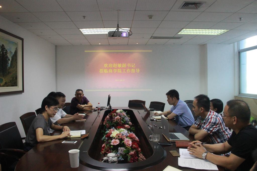 9月17日上午,新学期开学第一天,校党委副书记赵敏教授一行来商学院调研“挑战杯”准备情况,校团委屠霁霞书记陪同一起调研。学院党政领导班子、办公室、学生科相关人员参加了会议。