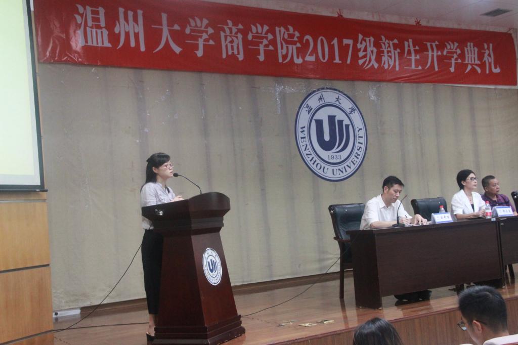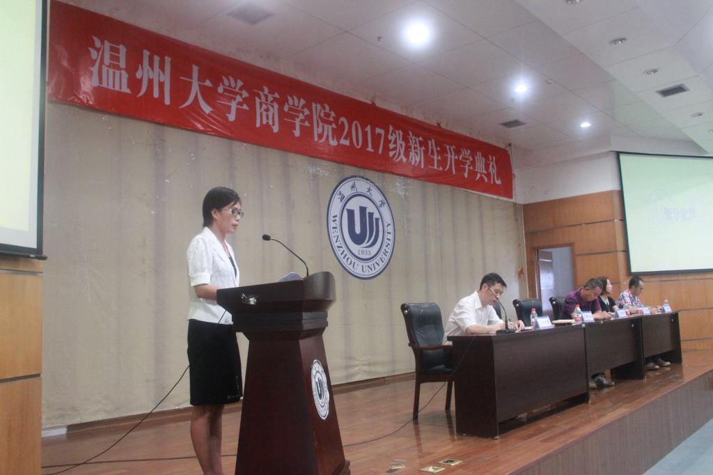 庄严肃穆的国歌声拉开温州大学商学院2017级新生开学典礼的帷幕。郑彩莲书记在致辞中代表学院向17级新生的到来表示衷心的祝贺和诚挚的欢迎。郑书记围绕“概率与你”的主题,向新生提出“提高大学期间成才的概率、提高大学期间善于交往的概率、提高大学期间强身健体的概率、提高大学期间自我保护的概率”四方面的期望。她以17届优秀毕业生13金融工程班的朱圆缘同学为例,鼓励新生多与牛人交往,她认为交往是一种能力,善于交往更是一种智慧,要在交往中提升自己的格局;郑书记还以麻豆传媒