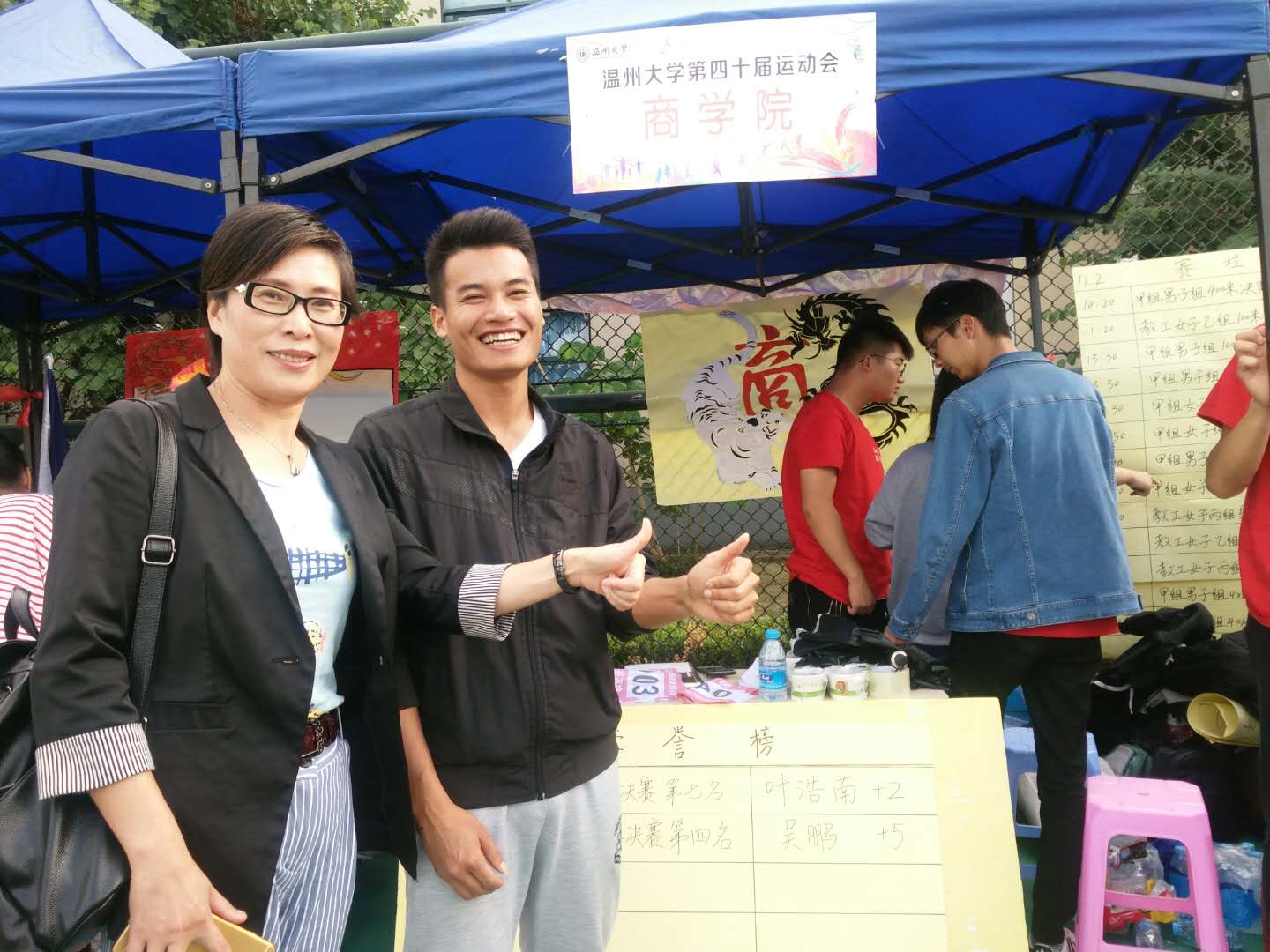 郑彩莲书记在刘书记之后来访,甫一现身,便亲切地向埋头工作的同学们打招呼。见郑书记亲切的笑容,在场的商学院主席以及学生会干事们均停下手中的工作,起身向书记问好。随后,郑书记饶有兴趣地浏览成绩板上商学院运动健儿们的得分和名次,对其创下的佳绩连连赞扬。但比起分数,郑书记显然对运动员们和学生会成员更为关注,一行行运动员名单所对应的学院班级甚至其所属的团学部门,她都准确无误地一一道来。同学们钦佩之余,也体会到了来自书记的关怀。除此之外,郑书记称自己的教工运动会项目即将开始,笑言希望得到大家的加油与鼓励,还与大家合照留念,书记和同学们脸上洋溢的笑容是其沟通的最好桥梁,气氛轻松愉悦、和谐融洽。