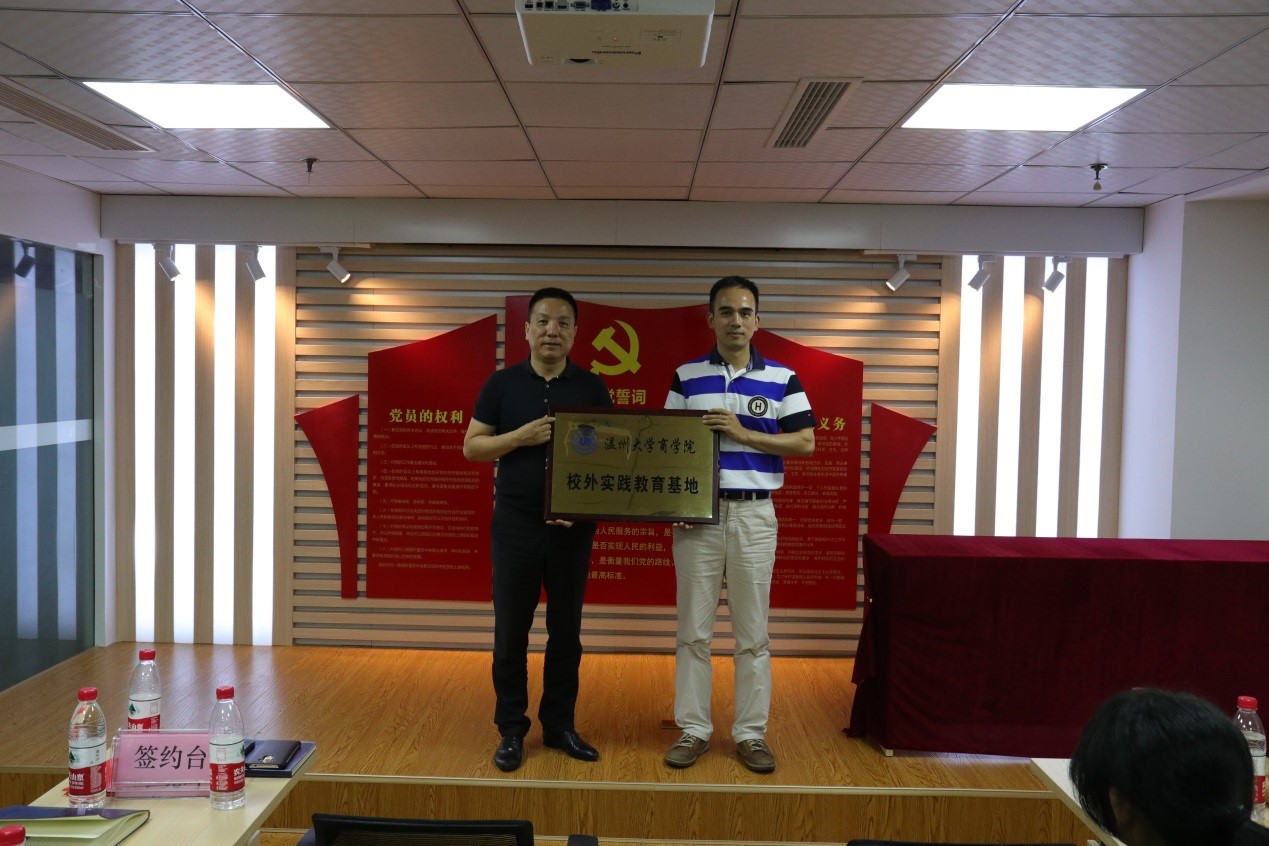 然后,举行了实践基地的签约仪式。罗建利副院长与陈晓晖董事长分别代表温大商学院和温州国贸集团达成了双方在未来友好合作、互惠共赢的伙伴关系,国贸集团公司将为温大国贸专业学生们提供一个实习与就业的平台。温大商学院罗建利副院长为温州国贸集团授牌。