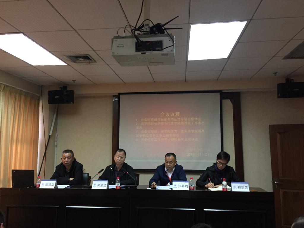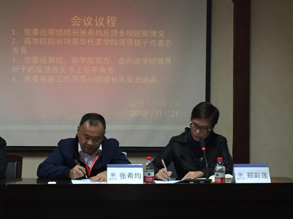 2018年11月21日,在商学楼A301室召开温州大学党委专项巡察商学院情况反馈会,学校巡察组和商学院全体教职工出席会议。会议由学院党总支书记郑彩莲同志主持。