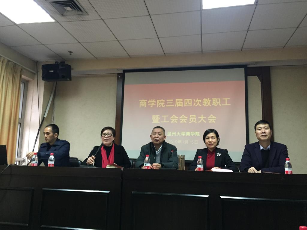 2019年1月15日下午,商学院三届四次教职工暨工会会员大会在北校区商学楼A301隆重召开,商学院全体教职工暨工会会员出席大会,会议由学院党总支郑彩莲书记主持。
